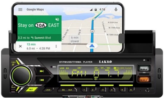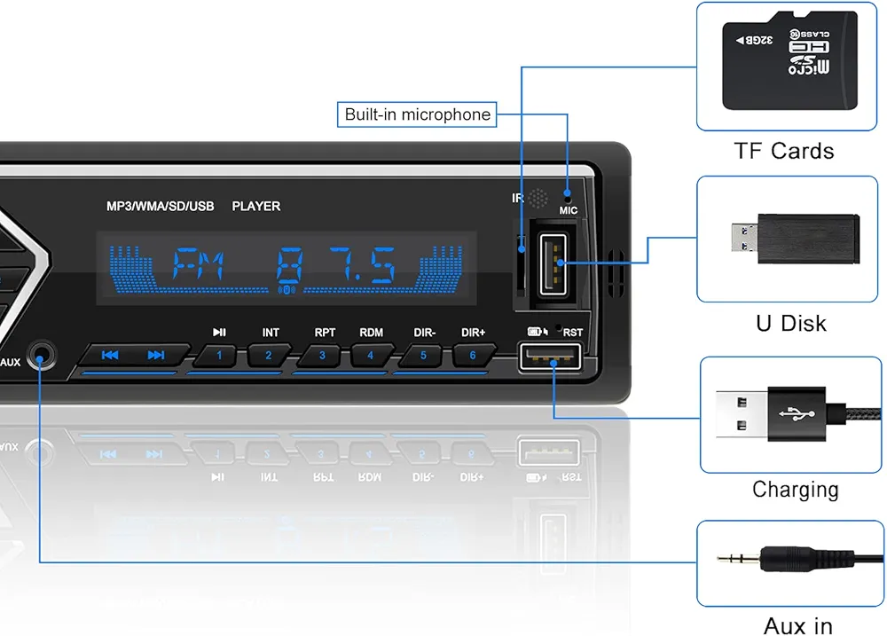 L’autoradio dispose également de deux ports USB (un pour la lecture de musique et l’autre pour la recharge rapide de votre téléphone), d’un lecteur de carte AUX, d’un lecteur de carte SD/TF, d’une sortie RCA, d’un microphone intégré, de divers effets d’égalisation et peut être connecté à un amplificateur.