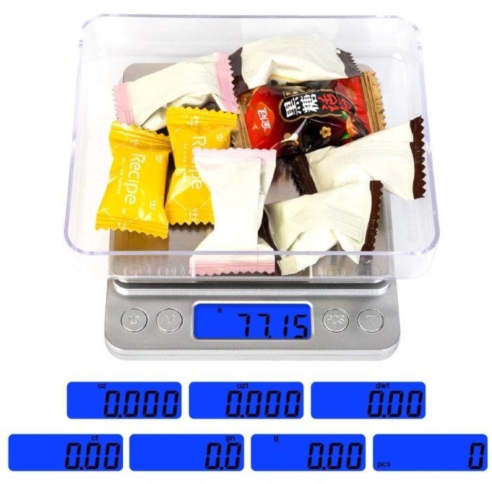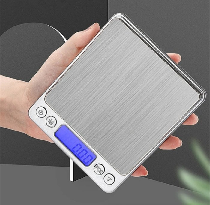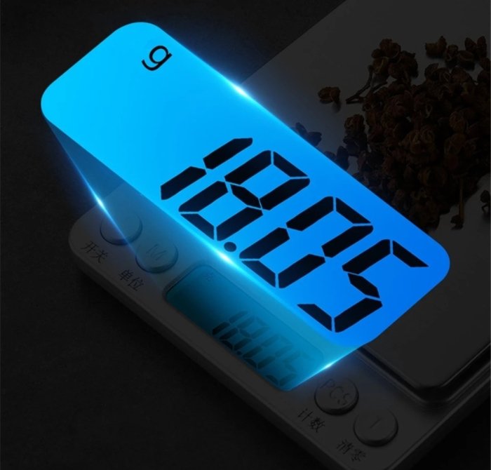 La balance peut être convertie en 6 unités (g, oz, gn, ct, ozt, dwt)Un capteur de haute précision permet une valeur de graduation de 0,3 g. Avec une plage de pesée maximale de 2000gLa balance présente une surface en acier inoxydable de tréfilage métallique, une base en plastique ABS et un écran d’affichage numérique LCD HD.