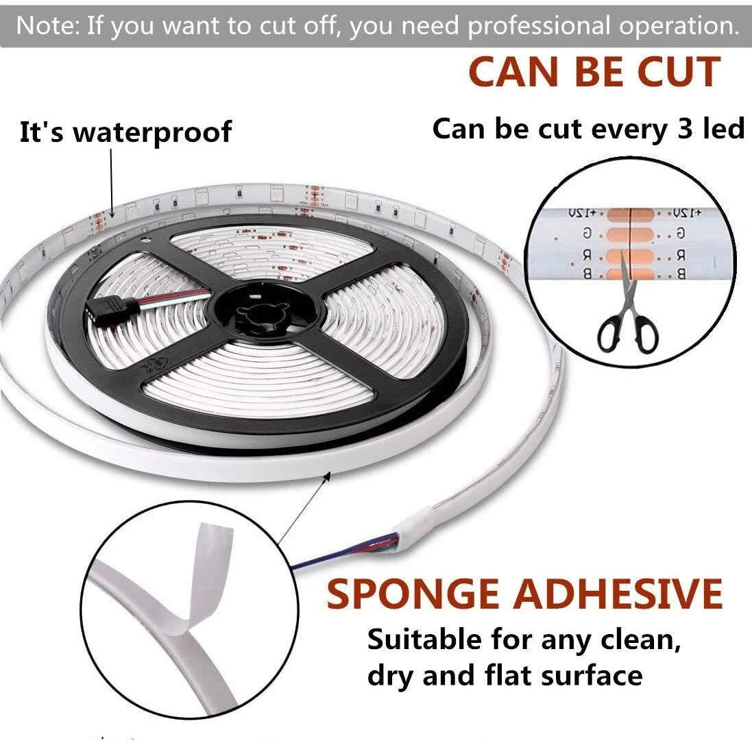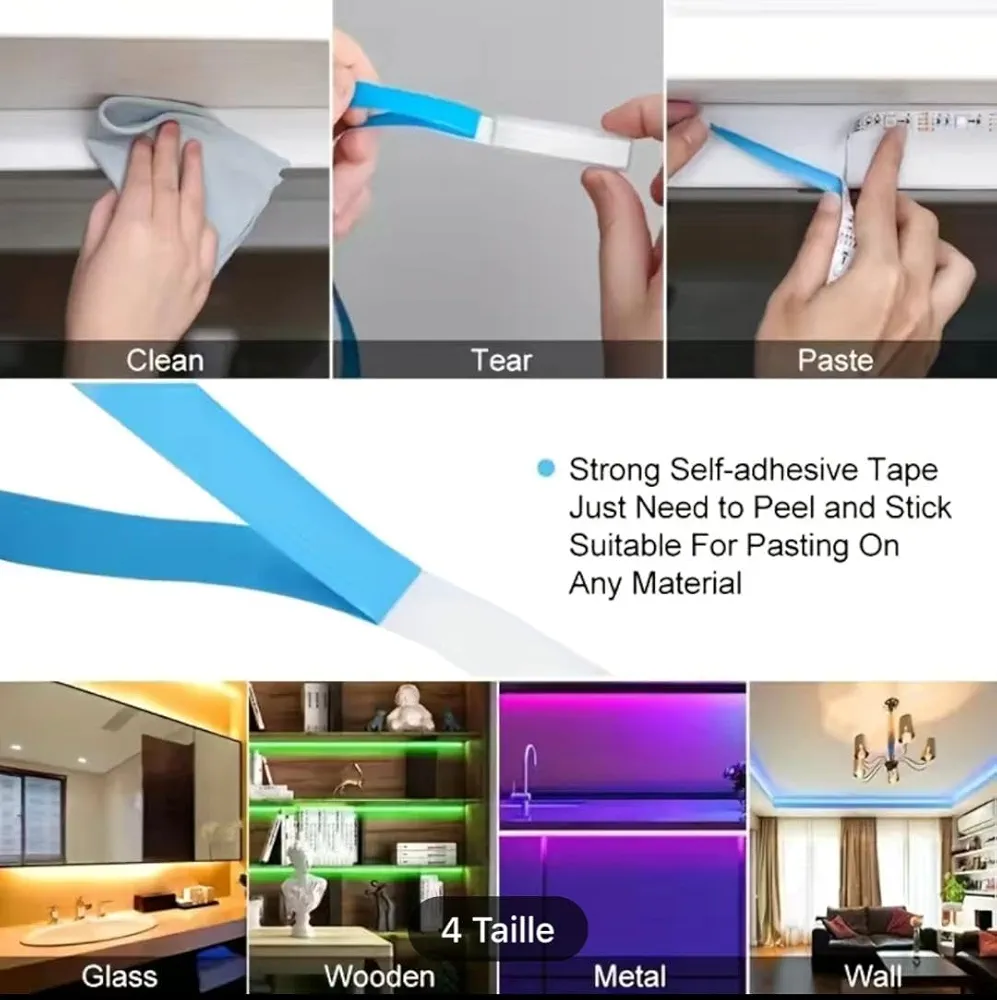 Dos auto-adhésif avec ruban adhésif, sûr et facile à utiliser, assurez-vous que la surface de montage est propre et sèche avant utilisation pour augmenter l’adhérence, placez la bande LED sur une surface plane, adaptée à la décoration domestique et commerciale.