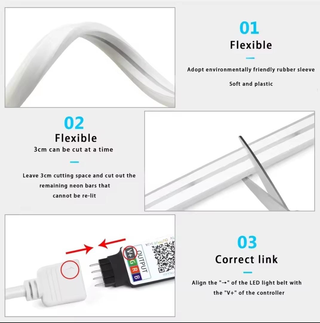 Contrairement aux bandes lumineuses LED traditionnelles, il n’y a pas de ruban adhésif au dos de ce type de bande lumineuse au néon ! La lumière au néon peut clignoter si vous avez utilisé un adaptateur inférieur à 3 A.