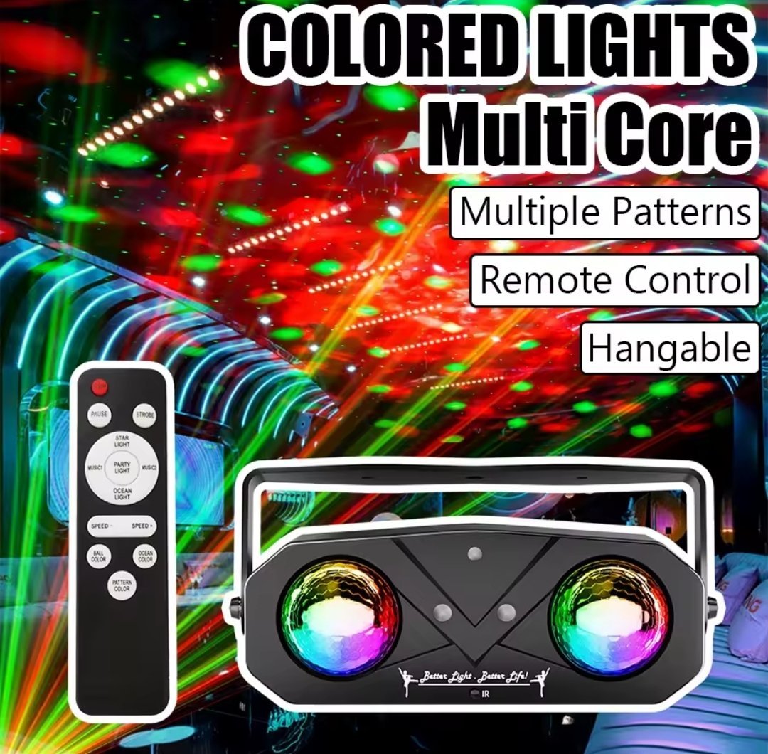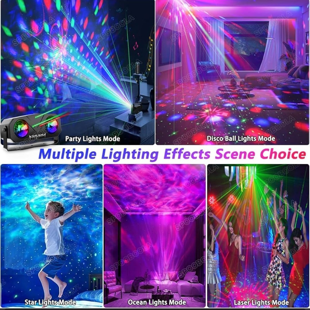 Ce modèle 5-en-1 amélioré combine éclairage de fond, laser et LED pour une expérience festive unique. Il offre 120 combinaisons d’images, des fonds LED multicolores et 2 combinaisons de faisceaux (vert et rouge), pour une ambiance scénique exceptionnelle grâce à des effets multiples et une projection haute définition.