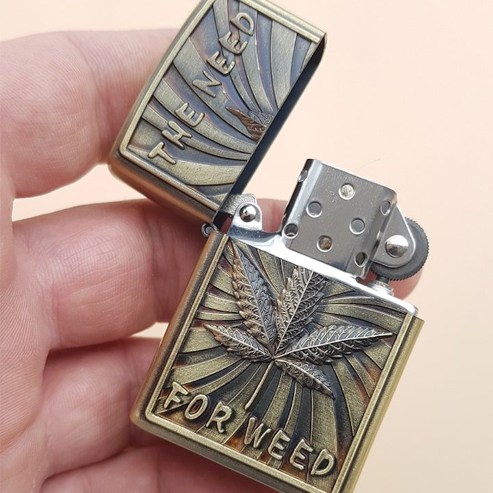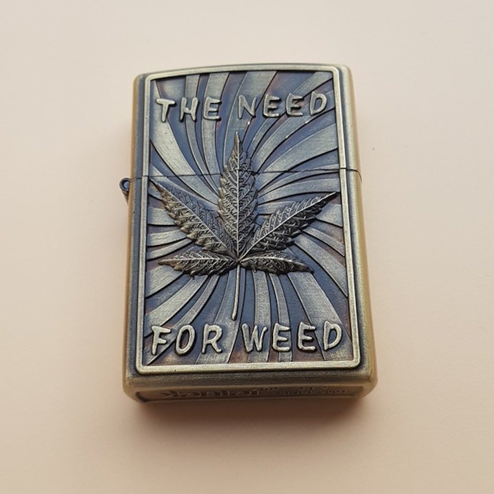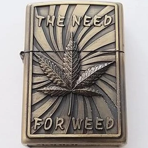 Briquet en métal 3D en relief avec une feuille de marijuana et inscription THE NEED FOR WEED.