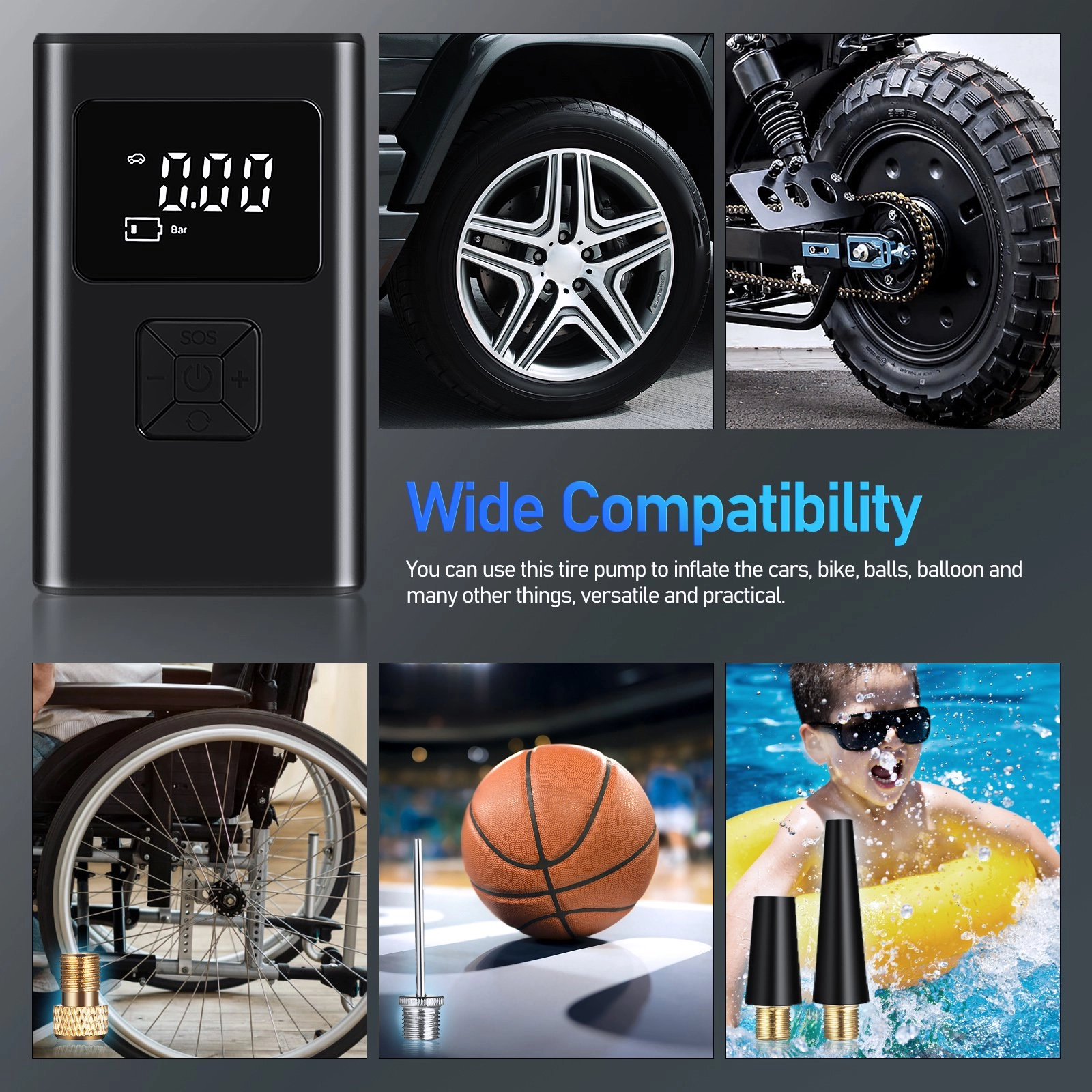 - Utilisations multiples : Gonfle facilement les articles gonflables tels que les matelas, les bouées, les équipements sportifs, ainsi que les pneus de voiture et de vélo.