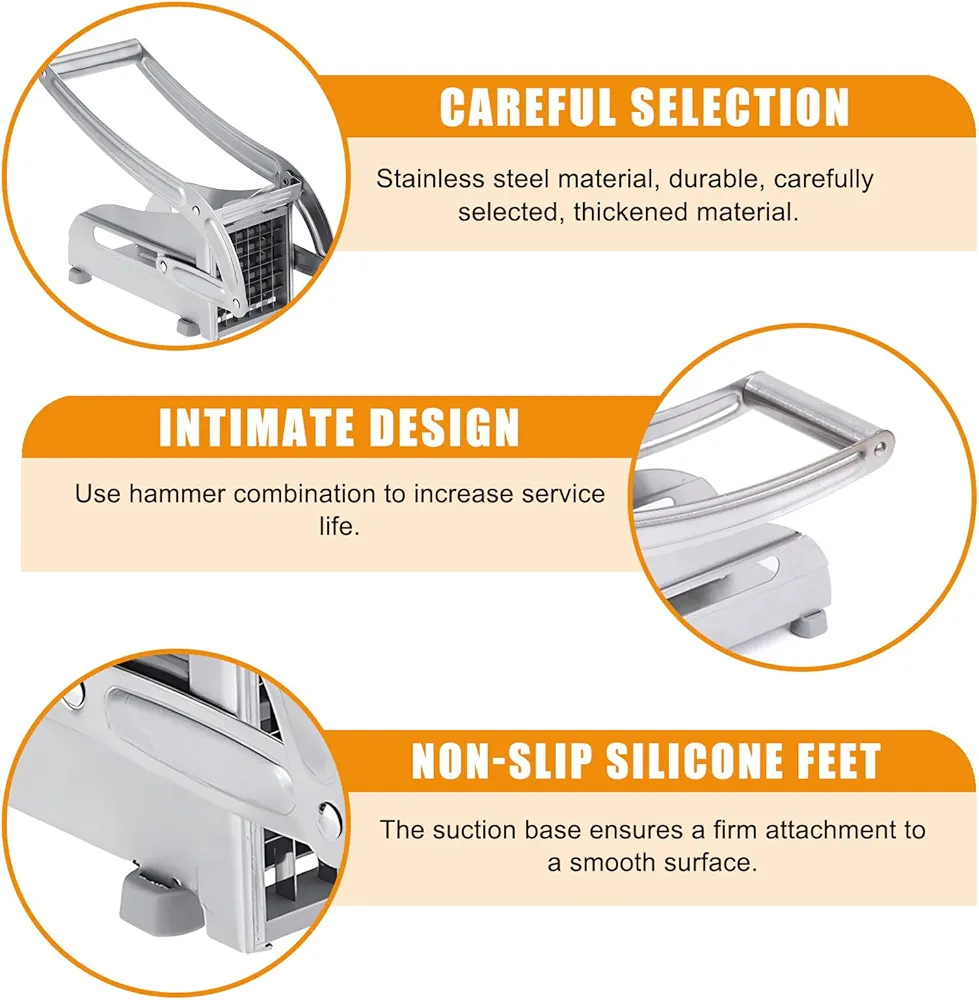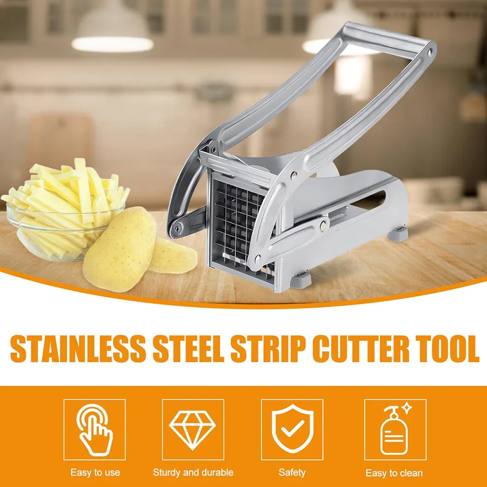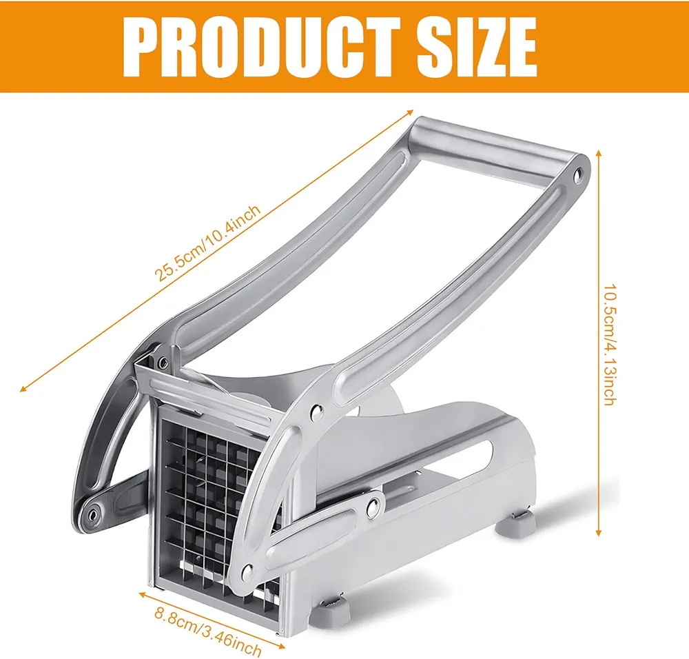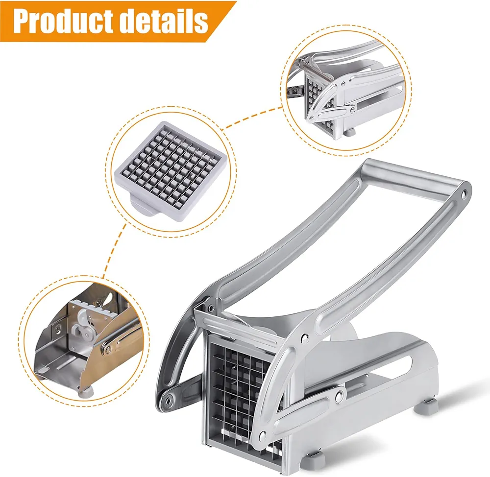 Le coupe-frites est fabriqué à 100 % en acier inoxydable de qualité professionnelle, sans pièces en plastique pouvant se casser et avec des lames en acier inoxydable remplaçables.