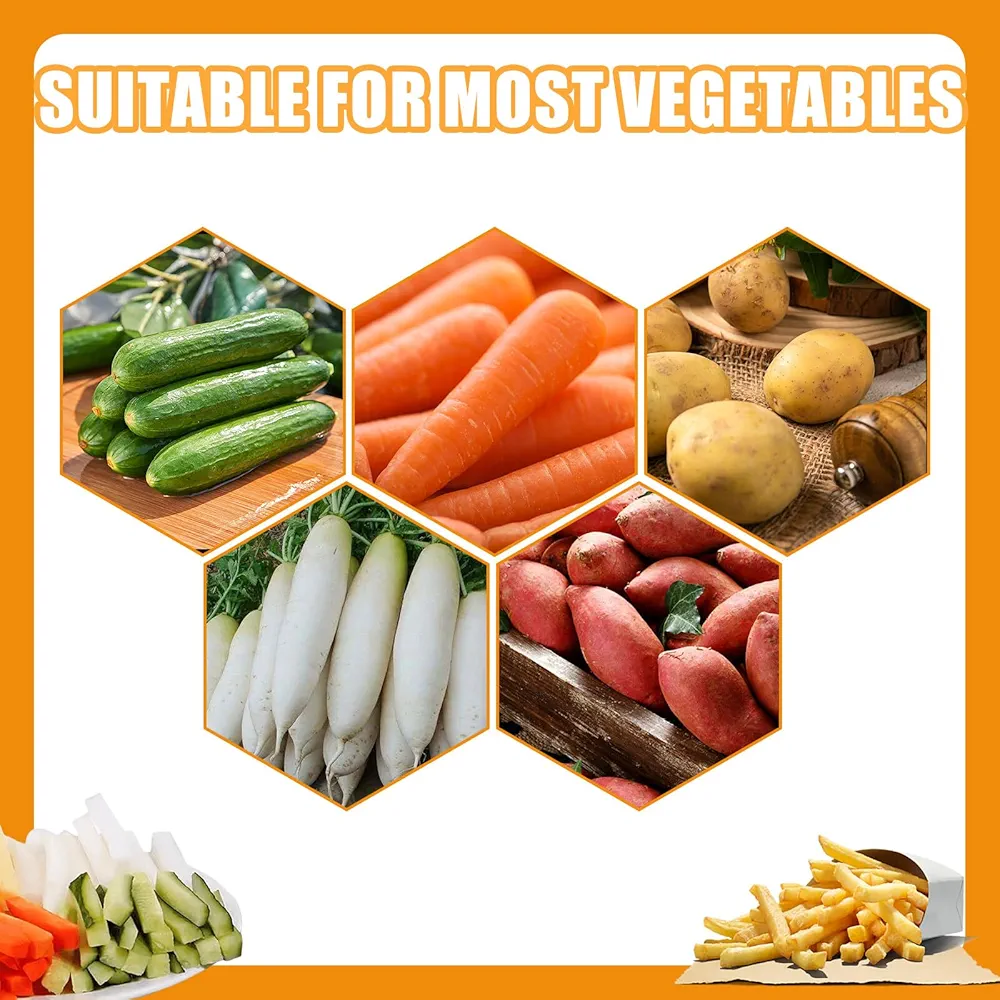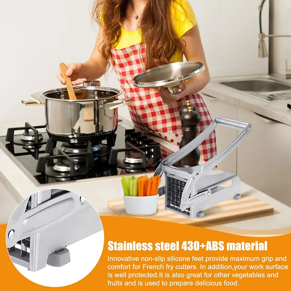 Coupez les pommes de terre et les légumes avec deux lames en acier inoxydable, fournies avec le coupe-frites en acier inoxydable.