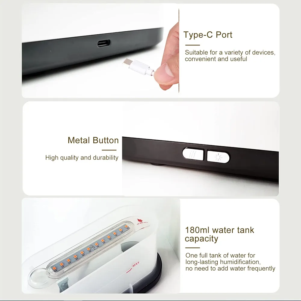• Humidificateur de nuit à simulation de flamme USB avec veilleuse LED.