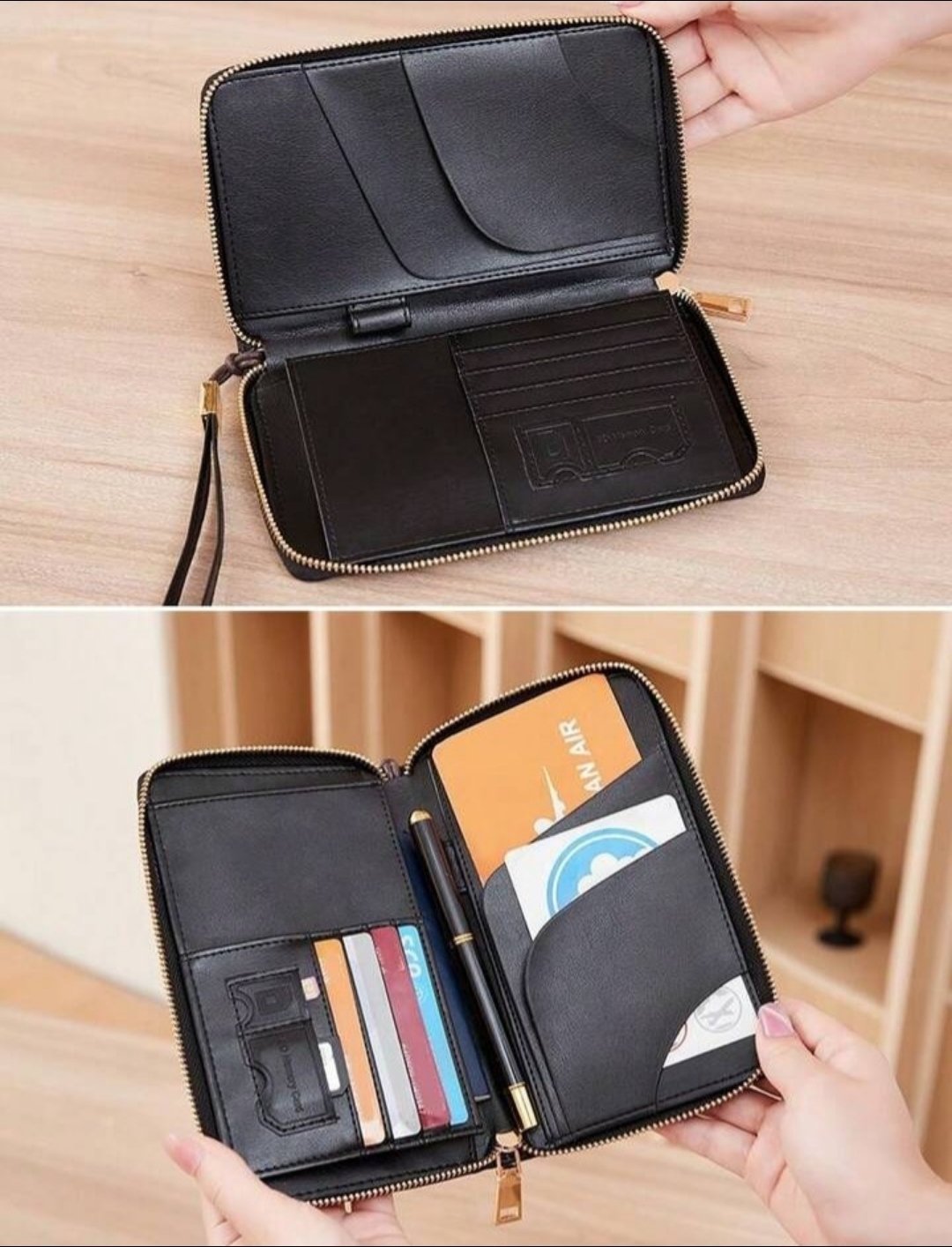 Elle peut contenir au moins quatre cartes de visite ou de crédit, un emplacement plus grand pour les cartes d’embarquement ou les reçus complets, et deux emplacements pour cartes SIM.