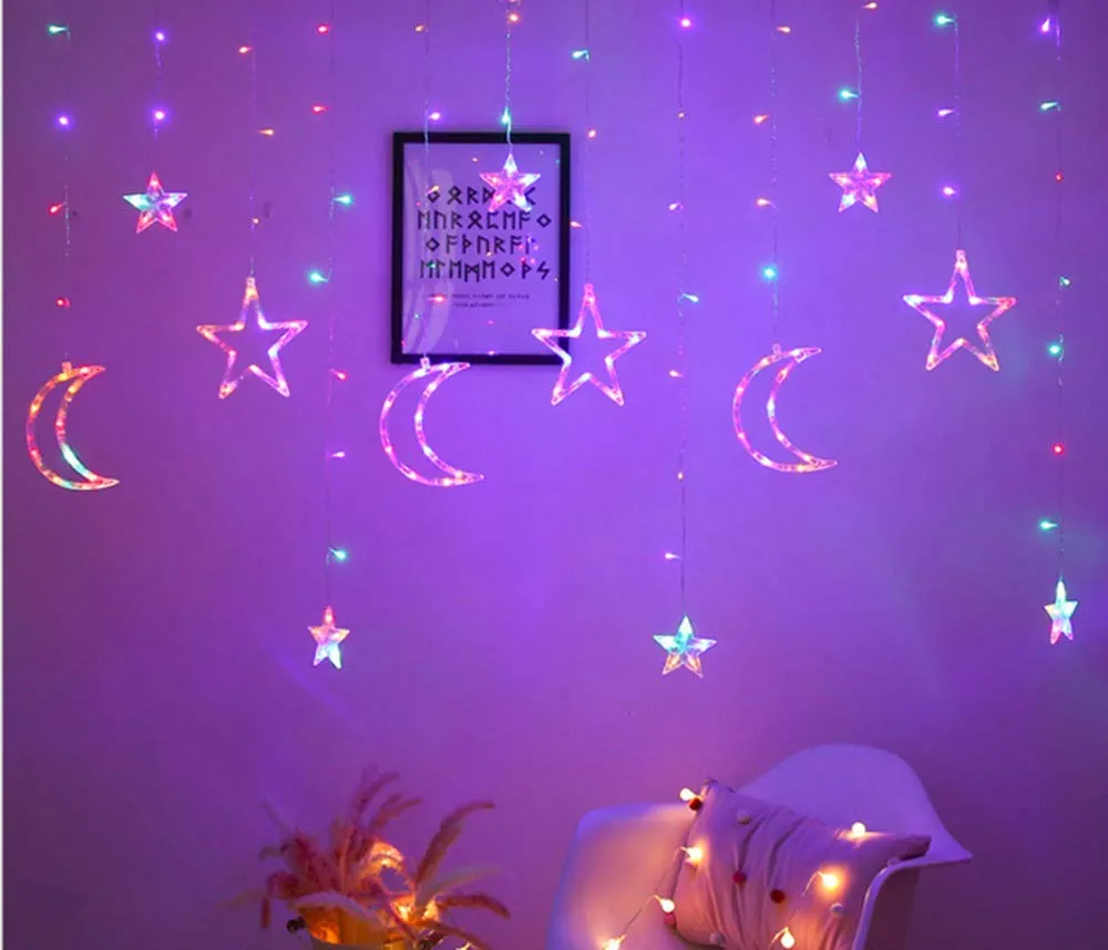 Les guirlandes lumineuses en forme d’étoile et de lune scintillantes ont été largement utilisées, adaptées pour une utilisation pendant le Ramadan, les mariages, les anniversaires, les fêtes, les familles, les cours, les fenêtres, les jardins, les restaurants, les centres commerciaux ou d’autres endroits.