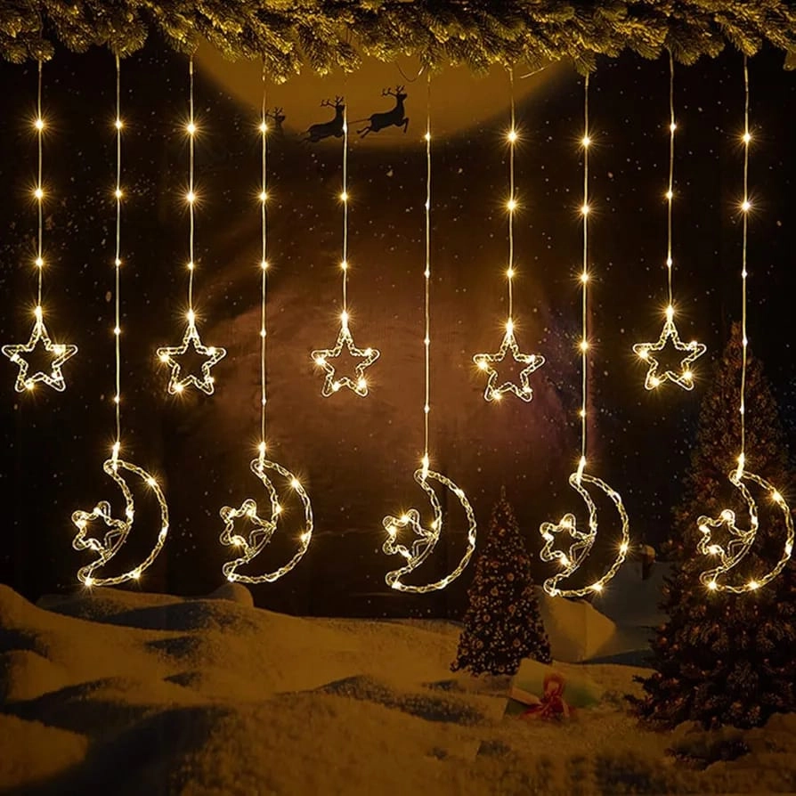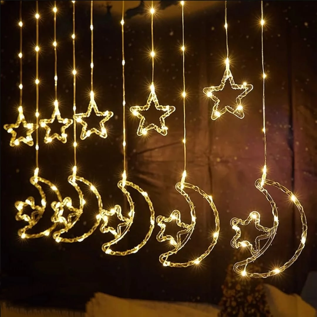 Les guirlandes lumineuses en forme d’étoile et de lune scintillantes ont été largement utilisées, adaptées pour une utilisation pendant le Ramadan, les mariages, les anniversaires, les fêtes, les familles, les cours, les fenêtres, les jardins, les restaurants, les centres commerciaux ou d’autres endroits.