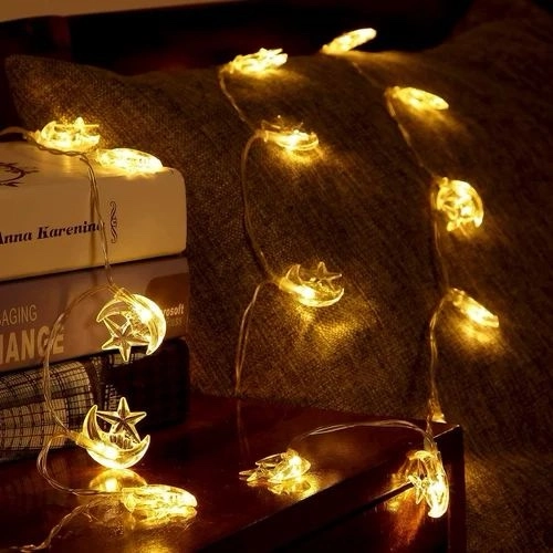 Cette guirlande lumineuse au design lune et étoiles diffuse une lumière jaune douce et apaisante, parfaite pour le Ramadan, les soirées cosy, la chambre ou le salon.