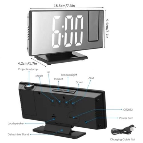 Grand écran miroir LED de 7,8″ : l’horloge de projection est équipée d’un grand écran LED miroir de 7,8″ amélioré, qui est non seulement pratique pour vérifier l’heure (12/24 heures), la date et la température (« C/F), mais peut également être utilisé comme miroir de maquillage.