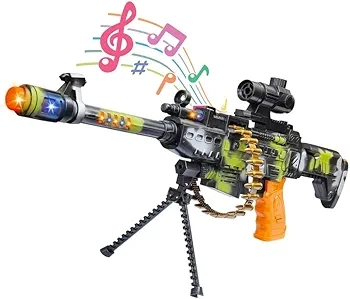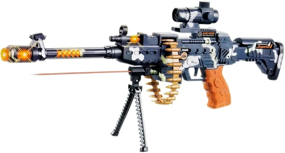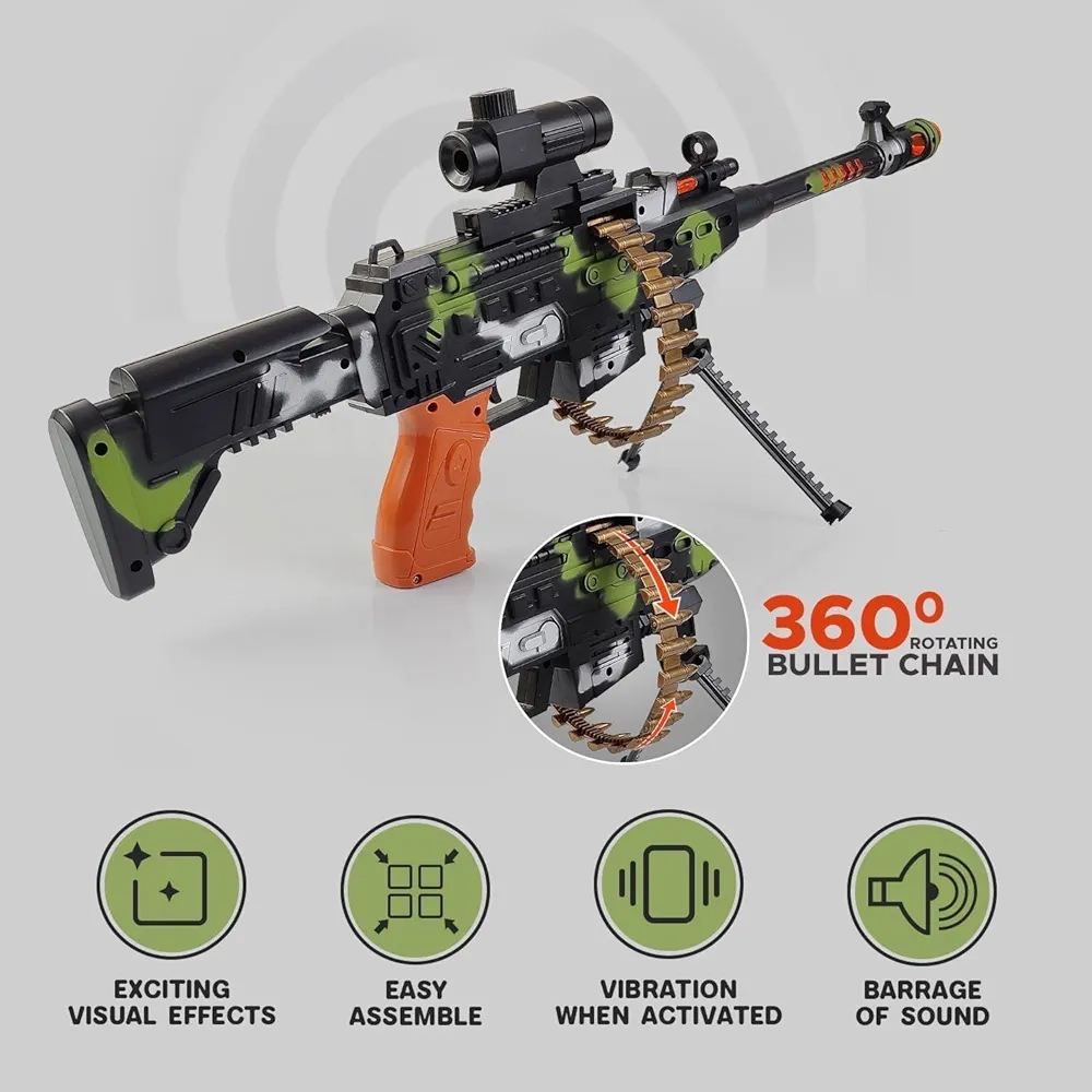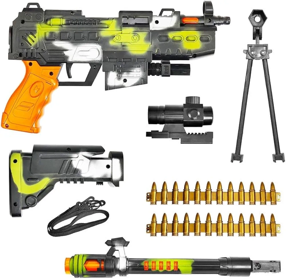 Cette mitrailleuse militaire, aussi fantastique qu’amusante, est équipée d’un impressionnant canon rotatif, d’une lunette de visée et d’un trépied pour une stabilité parfaite au sol.