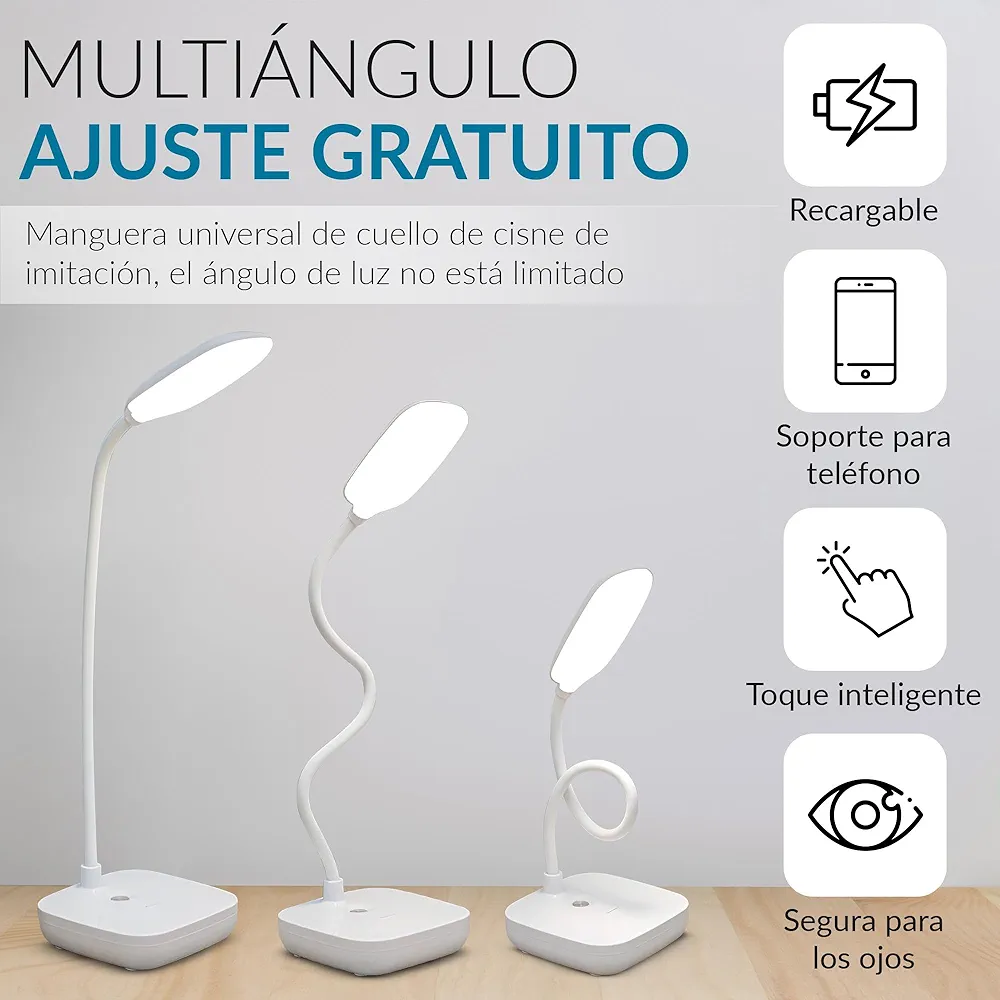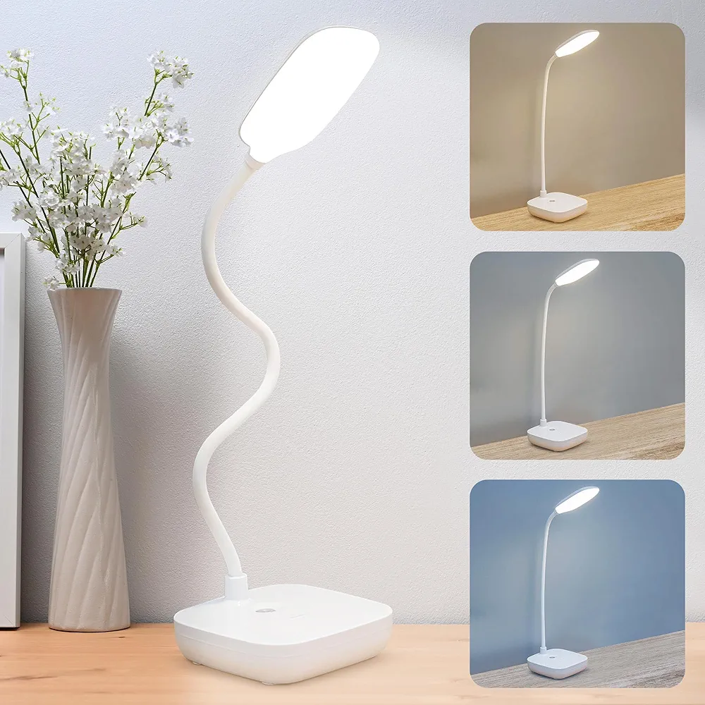 Lampe De Bureau Flexible Lampe De Bureau Flexible – Support Téléphone – Chargement USB – 3 Modes D’éclairage – Bouton Tactile – Blanc