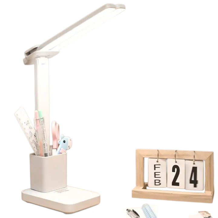 Rechargeable et polyvalente, cette lampe de bureau est dotée d’un porte-stylo permettant de ranger stylos, règles, crayons et autres fournitures.