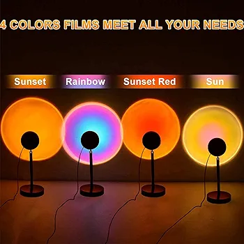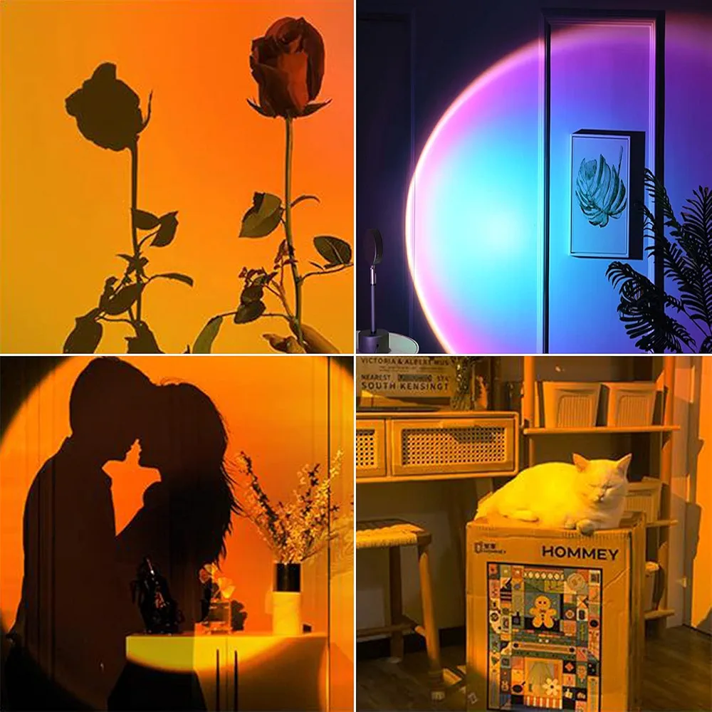 Cette lampe coucher de soleil romantique est disponible en 4 motifs de couleurs (Type A : Coucher de soleil, Type B : Arc-en-ciel, Type C : Rouge coucher de soleil, Type D : Soleil), apportant une atmosphère estivale romantique dans votre pièce.