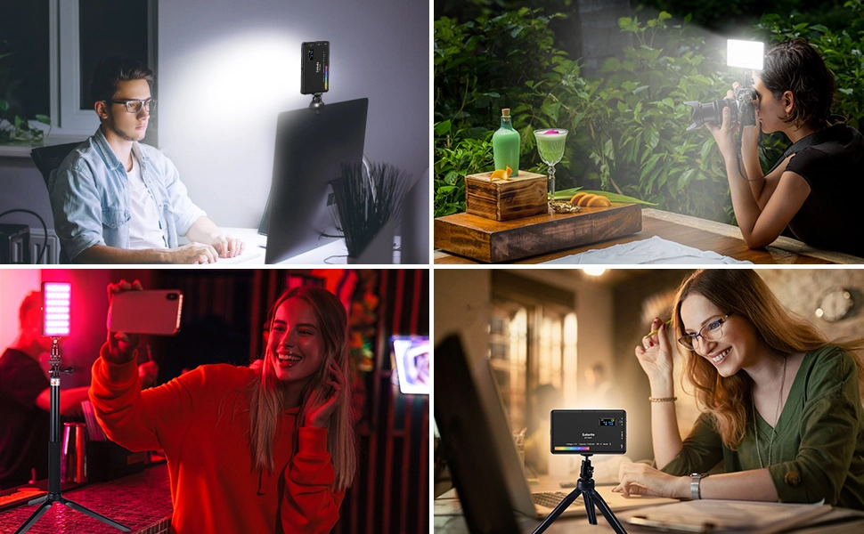 - RGB multicolore : plus de 10 modes d’éclairage, dont blanc, chaud, froid, stroboscopique et dégradé.