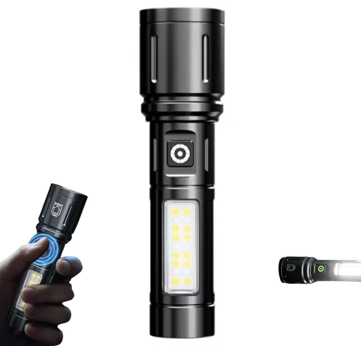 - Lampe torche LED portable ultra-lumineuse, rechargeable par USB-C, avec éclairage latéral COB, idéale pour les situations d’urgence en extérieur.