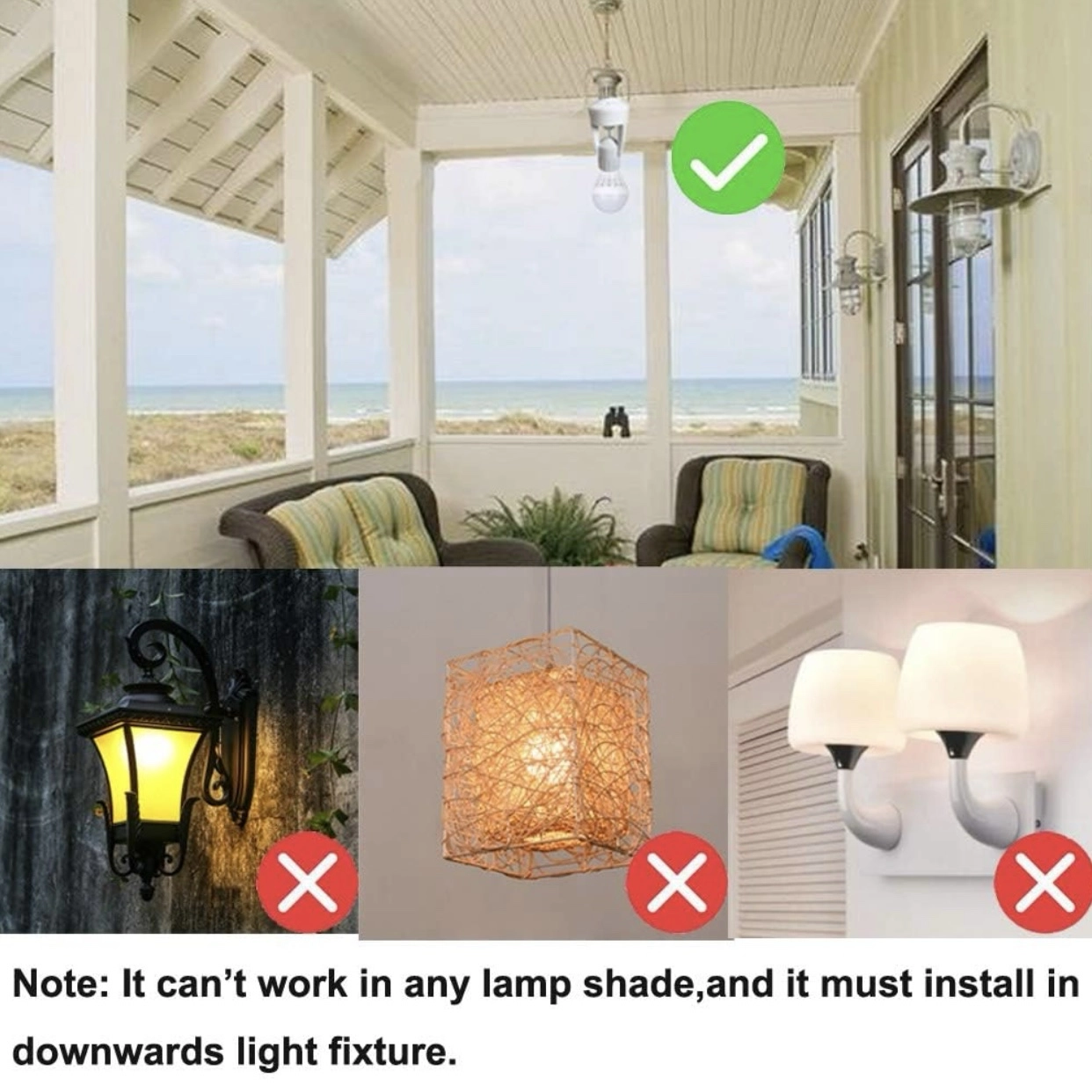 - Fonctionne uniquement avec abat-jour ouvert, installation vers le bas.