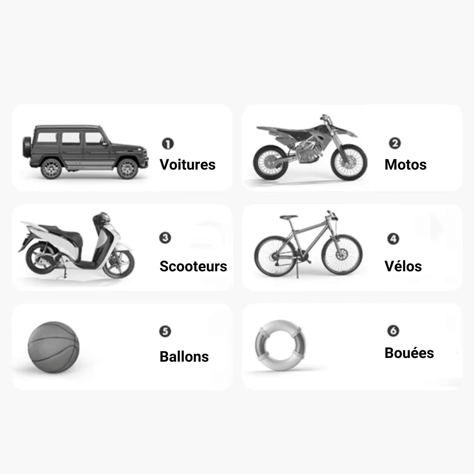 - Pour motos, voitures, ballons de football, ballons et scooters.