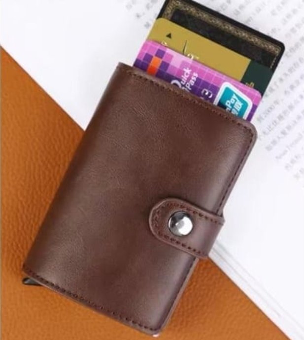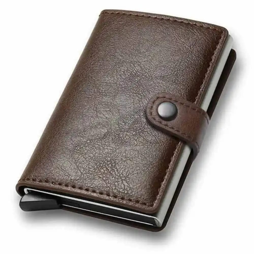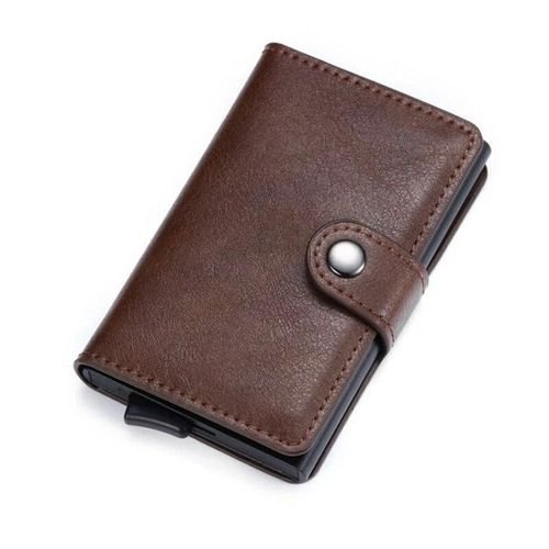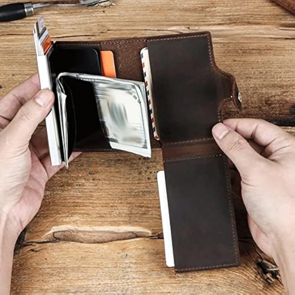 Mini Portefeuille Intelligent À Trois Volets – Fibre de Carbone et Cuir – 5 cartes – 3 Compartiments Pour Billets – Marron