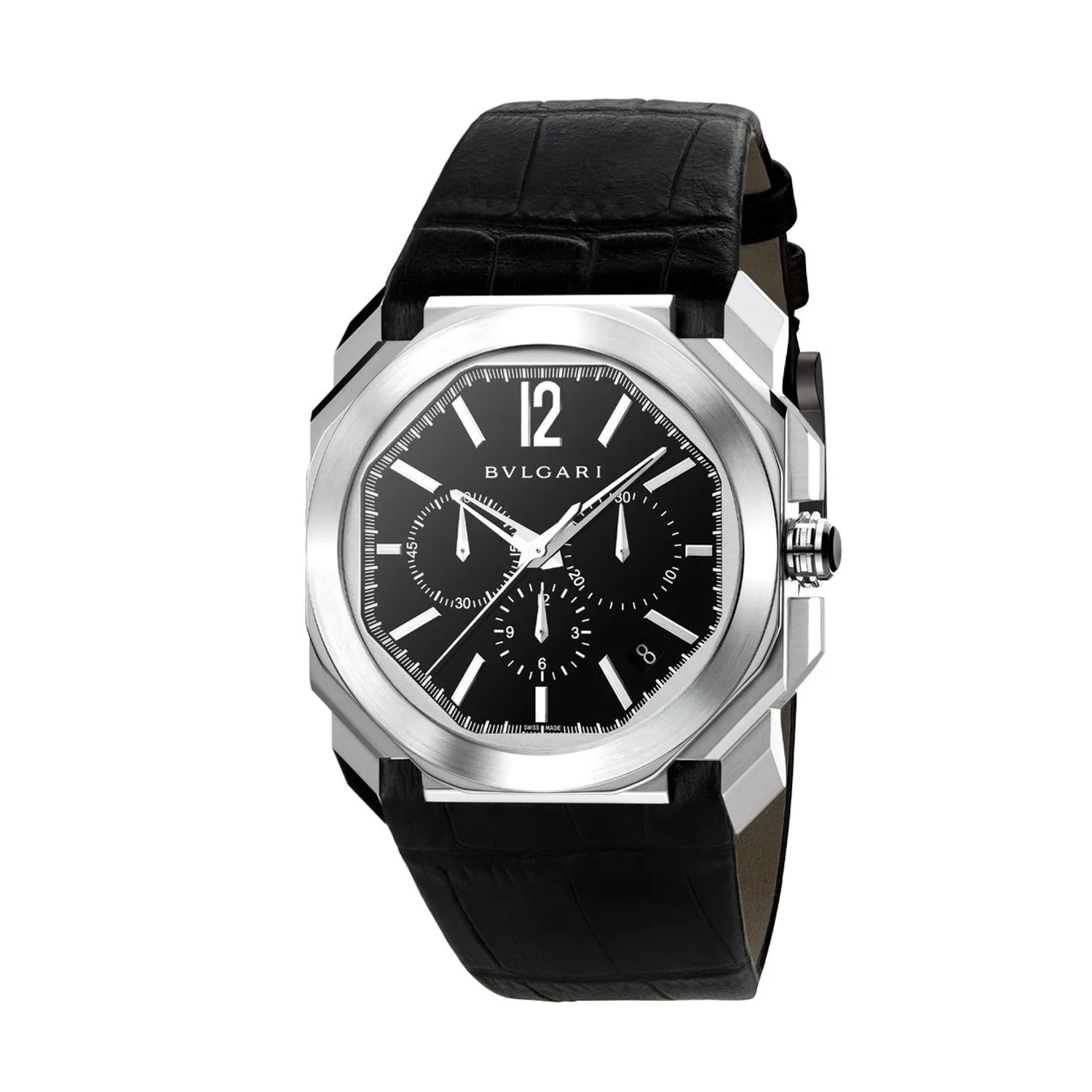 Montre Bulgari De Luxe – Boîtier En Acier – Bracelet En Cuir D’alligator – Résistante À L’eau – Noir