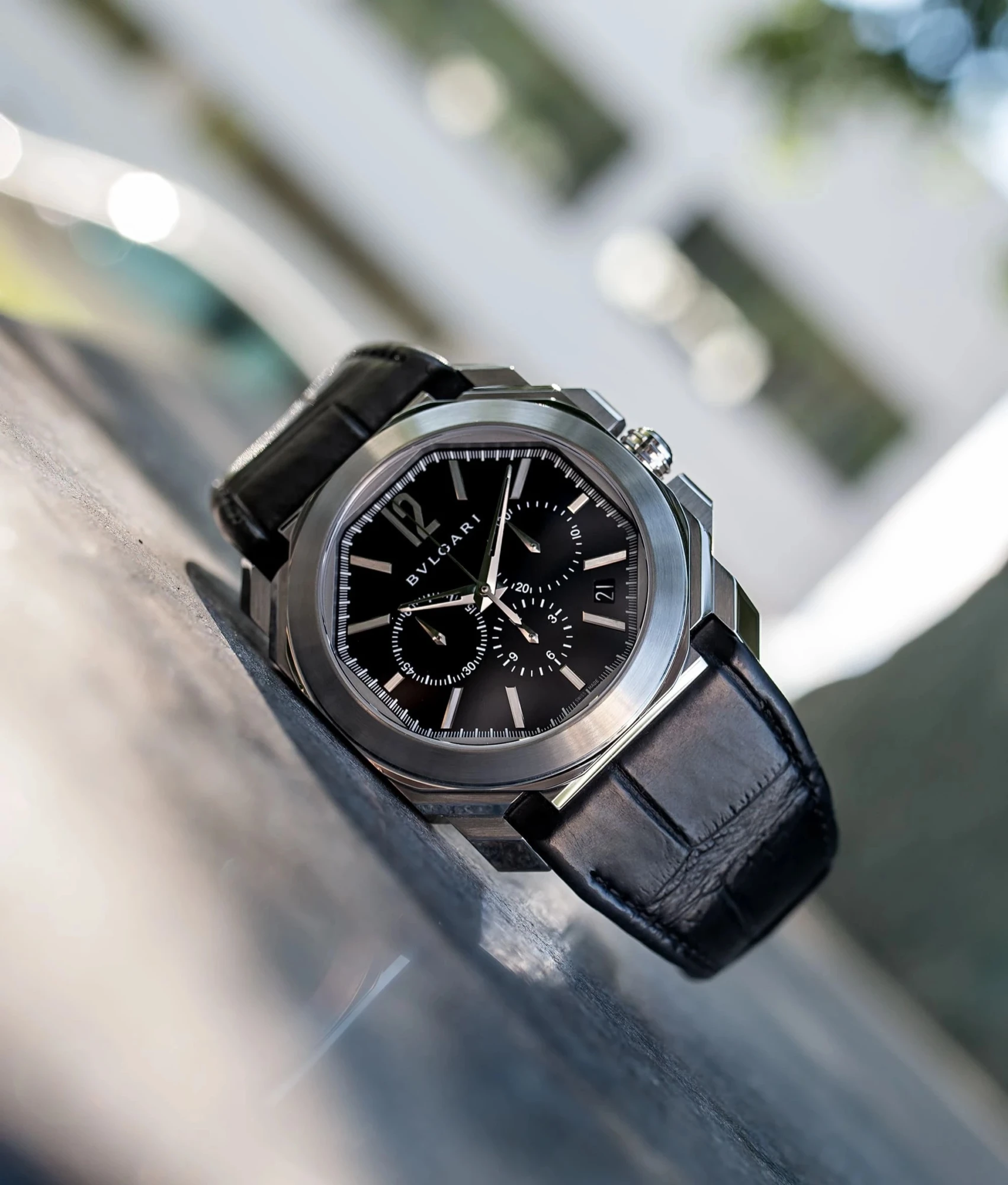 Il s’agit du chronographe Octo Finissimo G, aux lignes anguleuses et au cadran brun foncé soleillé, une touche chaleureuse qui sublime le design architectural si particulier de la collection.