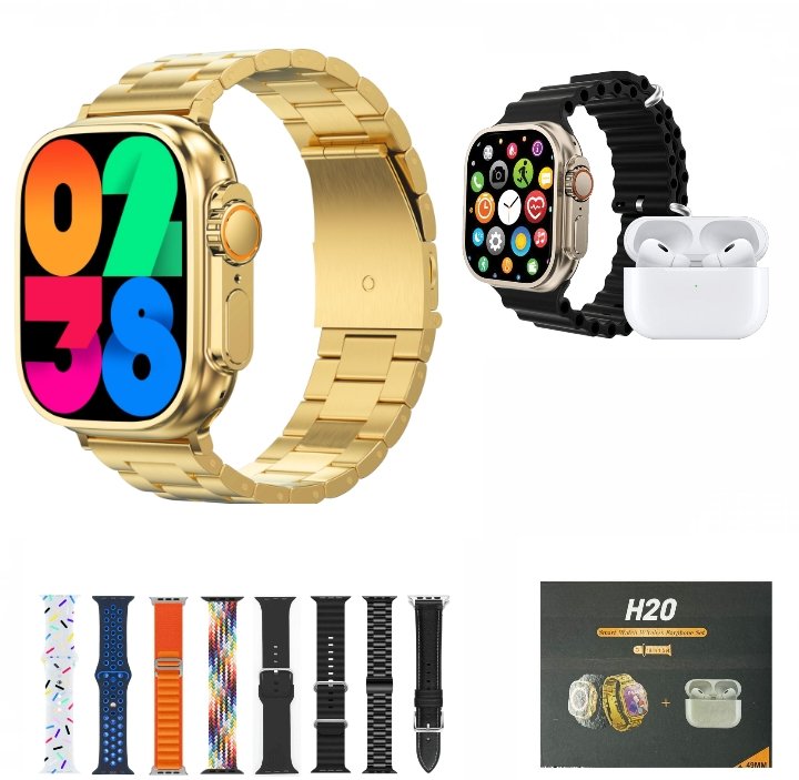 Montre Connectée H20 En Acier Inoxydable Et Écouteurs Sans Fil 10 en 1 – Appels Bluetooth H20 Ultra – Résistante ÀL’eau- Écran HD – 7 Bracelets En Silicone