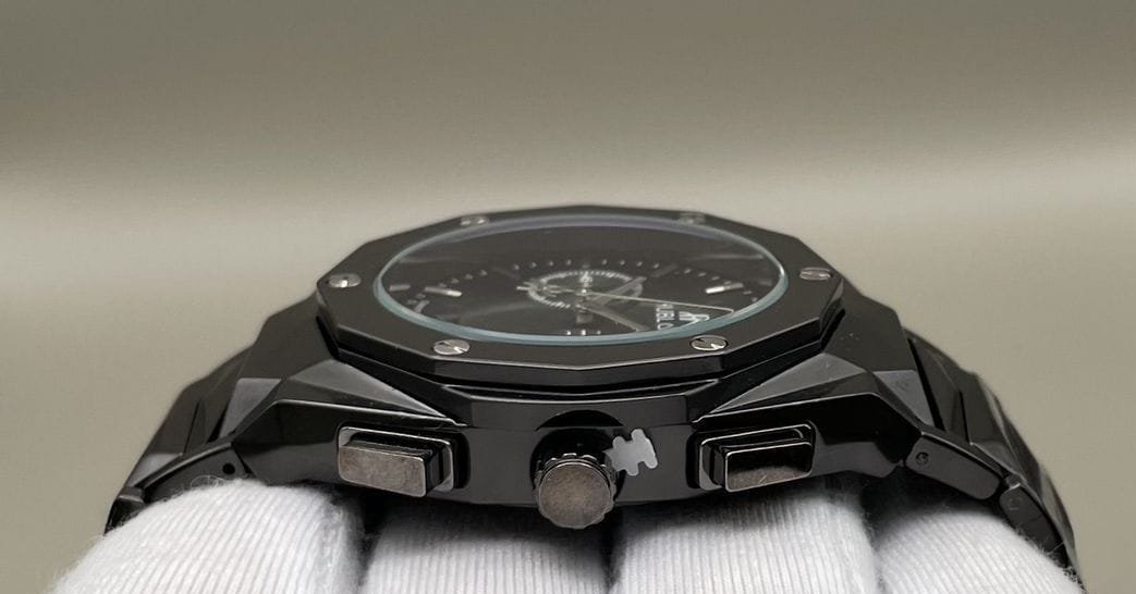Design inspiré haut de gamme : boîtier travaillé avec précision, lignes dynamiques, lunette texturée et cadran complexe pour une présence imposante.
