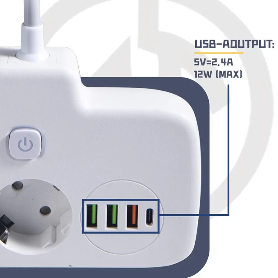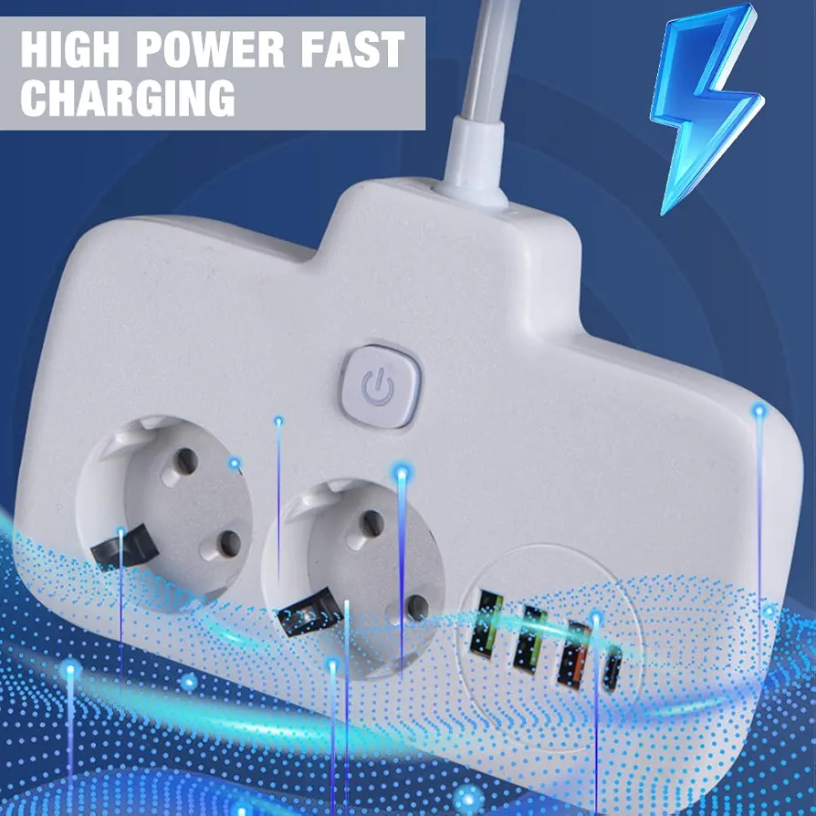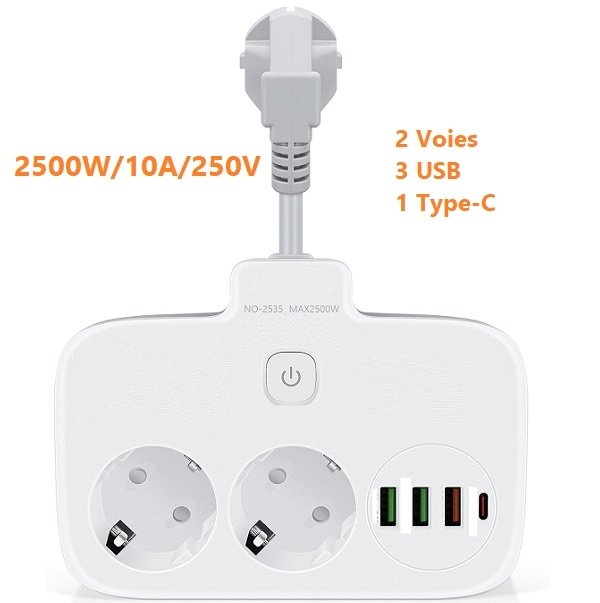 Fonction puissante:Multiprise à 2 prises avec 3 ports USB : 2 500 W (max) ; tension de fonctionnement : 250 V ; Alimentation : 10 A USB C peut charger rapidement jusqu’à 3 A, assurant une charge sûre et rapide de plusieurs appareils.