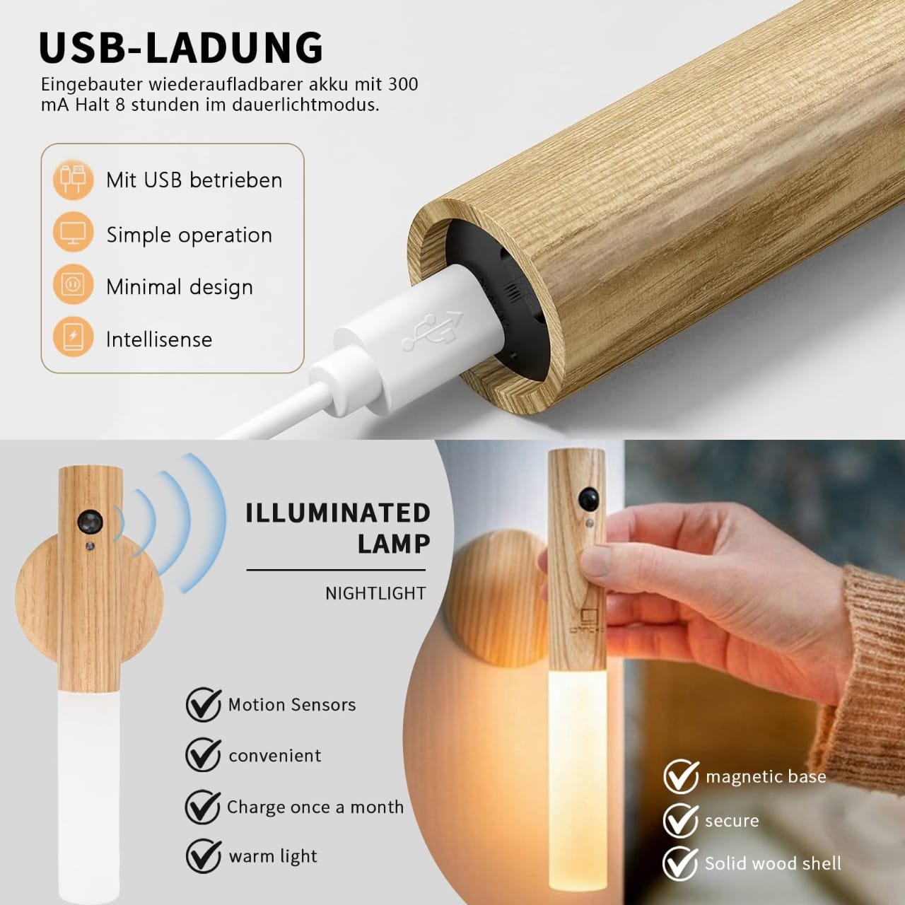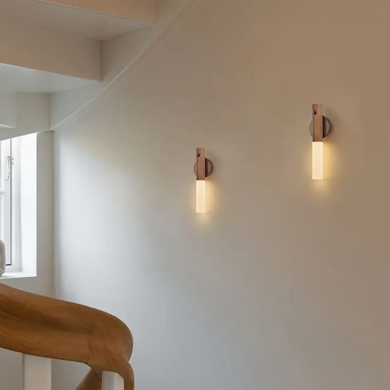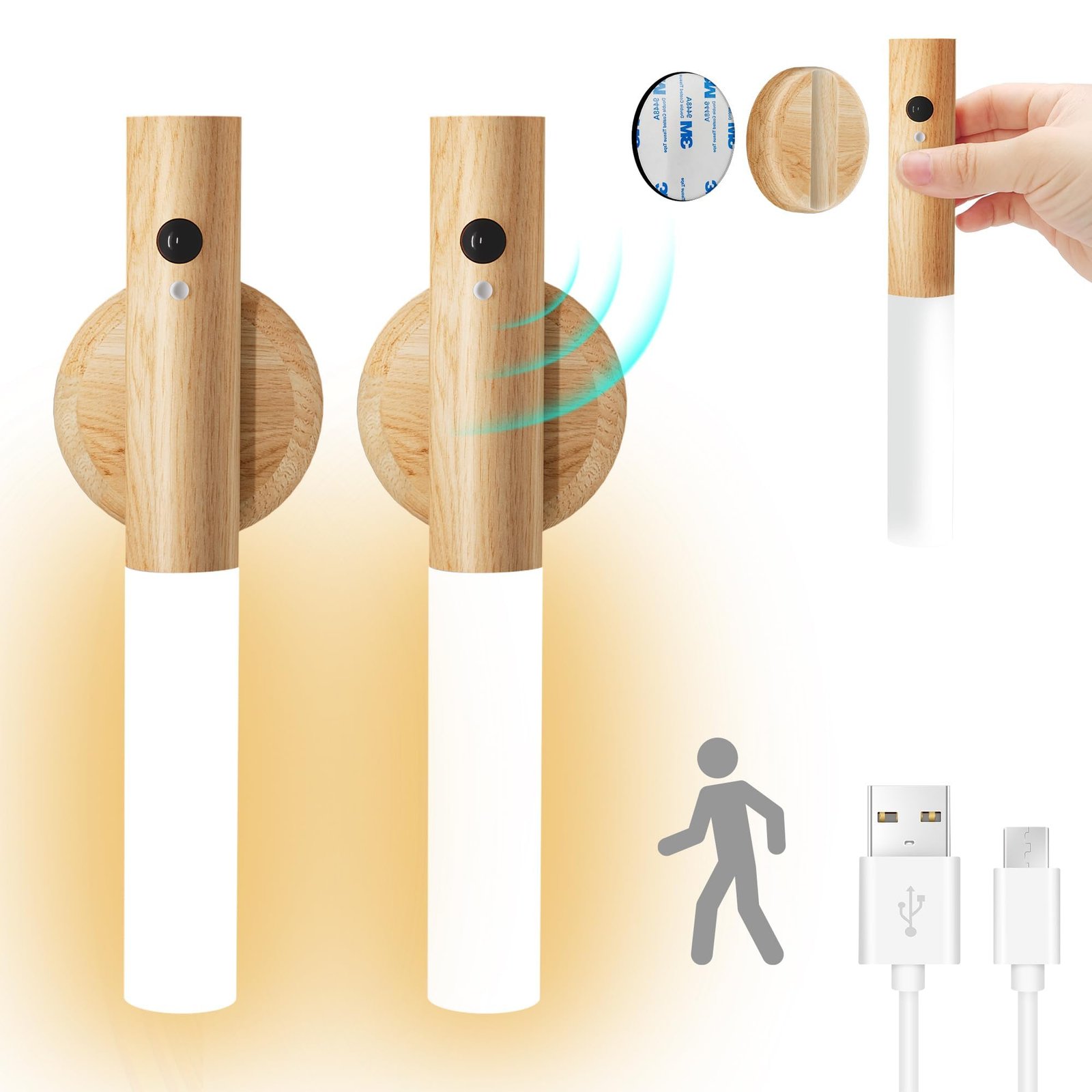 Pack De 2 Applique Murale En Bois – Veilleuse D’intérieur – Détecteur De Mouvement – Sans Fil – Rechargeable
