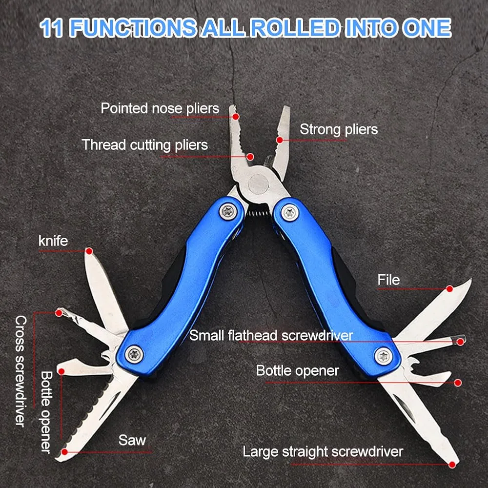 La pince multifonction 11 en 1 contient des outils tels qu’une pince à bec effilé, une pince standard, une pince à câble, un tire-bouchon, un tournevis à un mot, un tournevis cruciforme, une scie, un couteau, une lime à ongles, etc., peuvent répondre à vos différents besoins.
