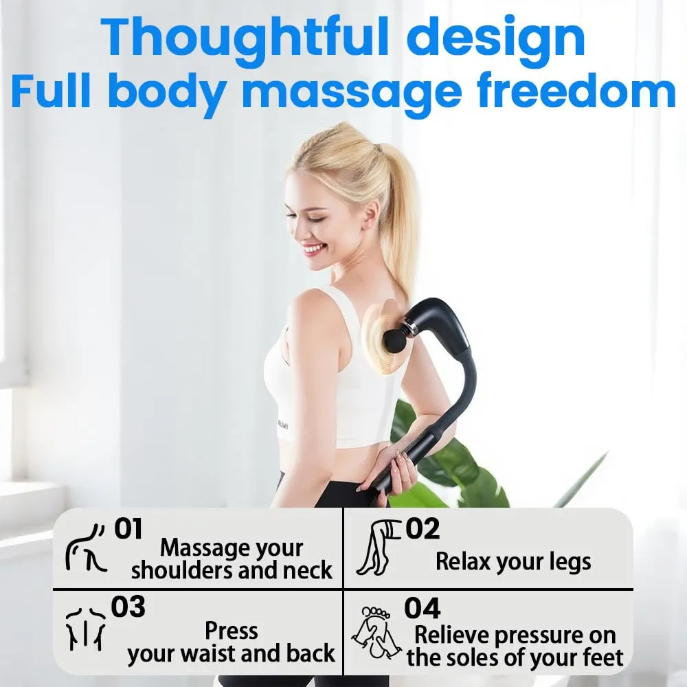 Notre pistolet de massage est doté d’un manche extra-long et d’un design ergonomique en U à 120 degrés, dépassant les limites de la longueur des bras et épousant naturellement la forme de la colonne vertébrale et de la taille. Contrairement aux pistolets de massage traditionnels, il vous permet de relaxer tout le corps sans vous pencher ni demander d’aide, vous permettant ainsi d’atteindre facilement les zones difficiles d’accès comme le dos, les épaules, la taille, etc.