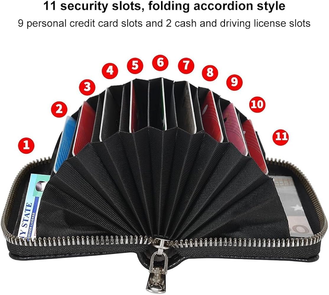 9 emplacements pour cartes de crédit et 2 emplacements pour billets les fentes accordéon permettent de mieux organiser vos cartes et de les insérer et les retirer facilement.