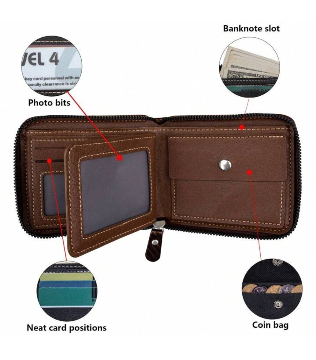 - Fermeture à glissière sur toute la longueur du portefeuille avec fermeture à glissière de haute qualité.