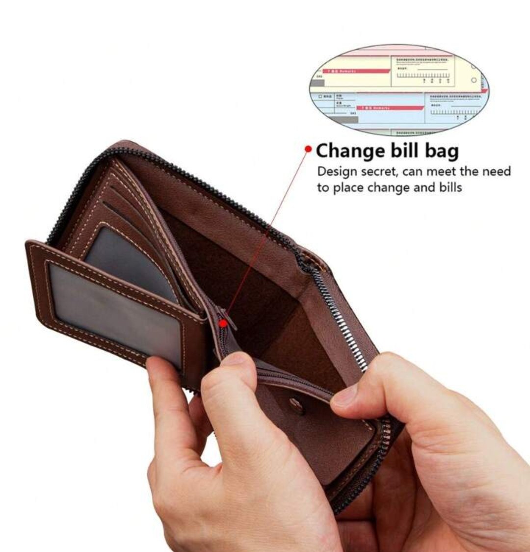 La poche zippée peut contenir des pièces de monnaie, de la monnaie, des reçus et plus encore.