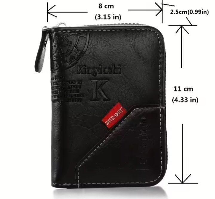 - Intérieur : Poche à monnaie, poche à billets, porte-photo, porte-cartes.
