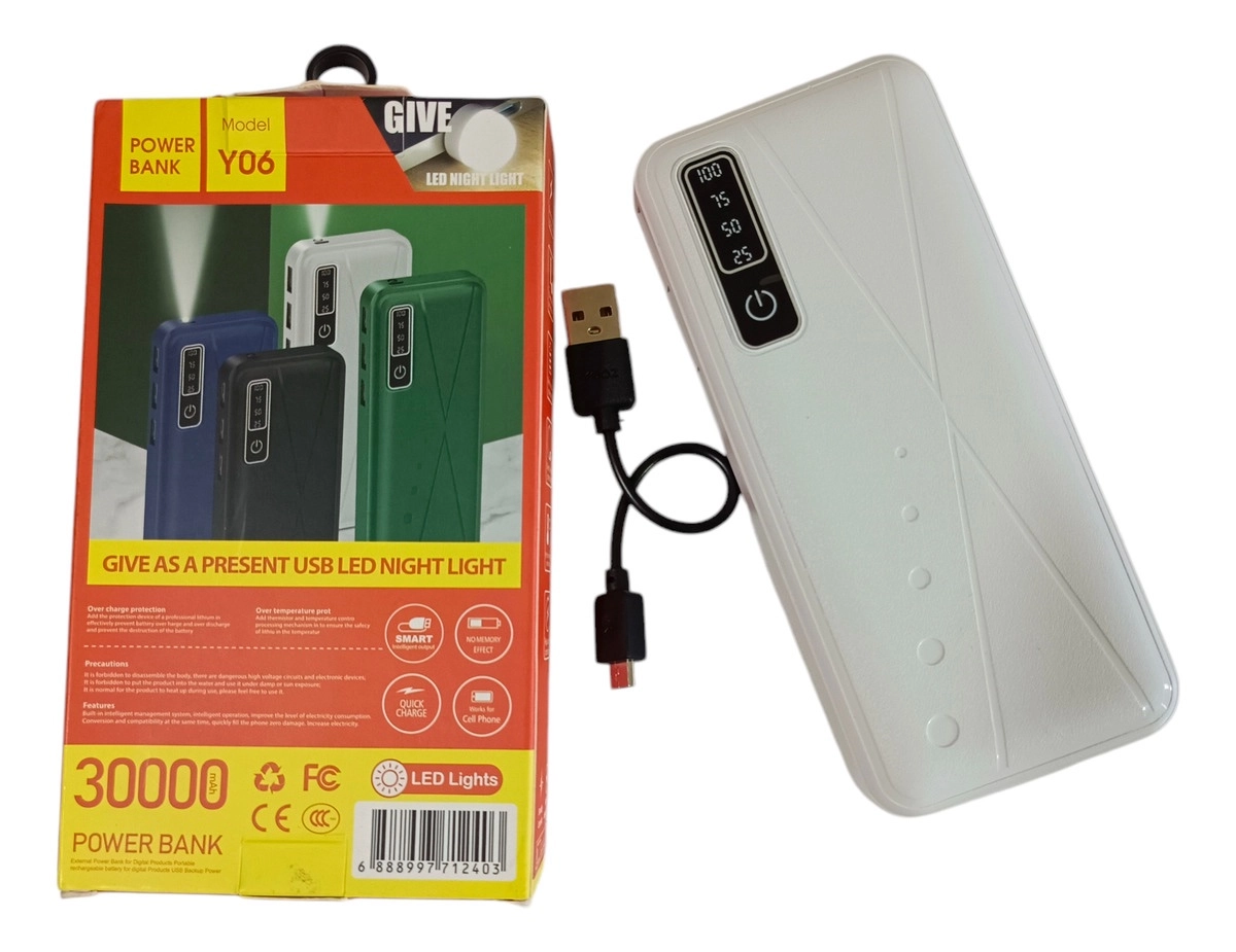 Power Bank Y06 – 30 000 mAh – Charge Rapide – Écran Digital & Lampe LED – Blanc
