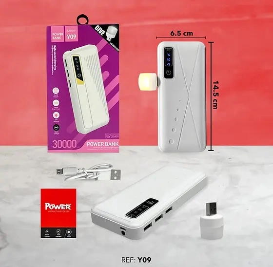 Power Bank Y09 – 30 000 mAh – Charge Rapide – Écran Digital & Lampe LED – Blanc