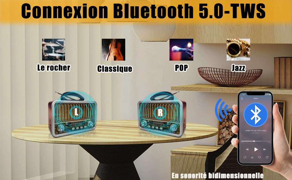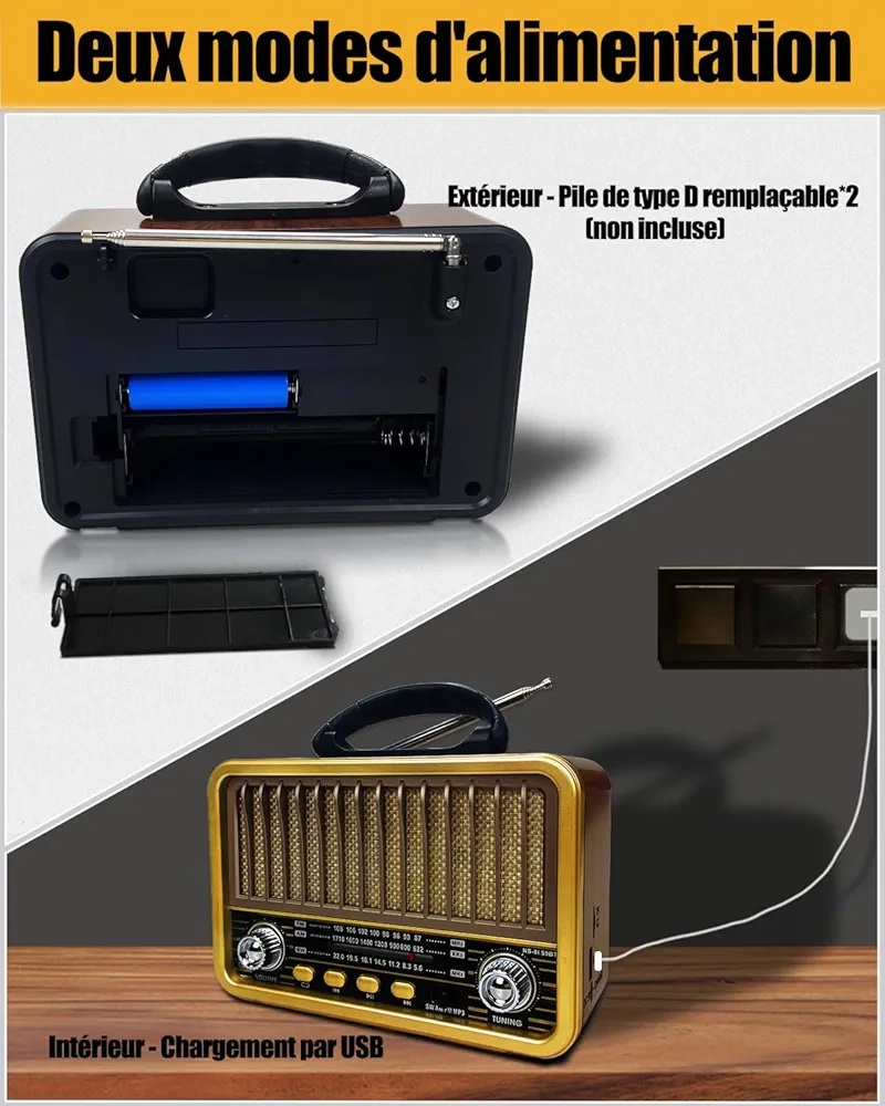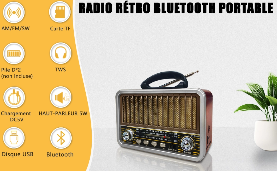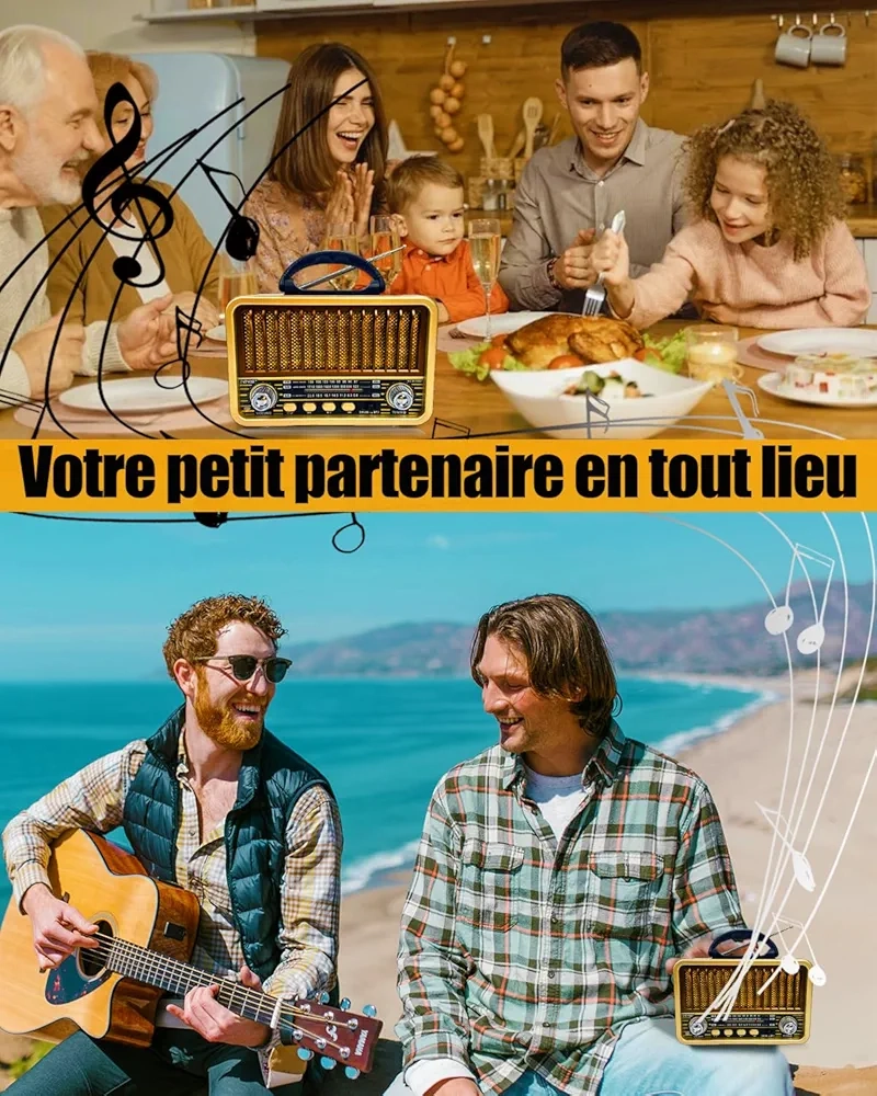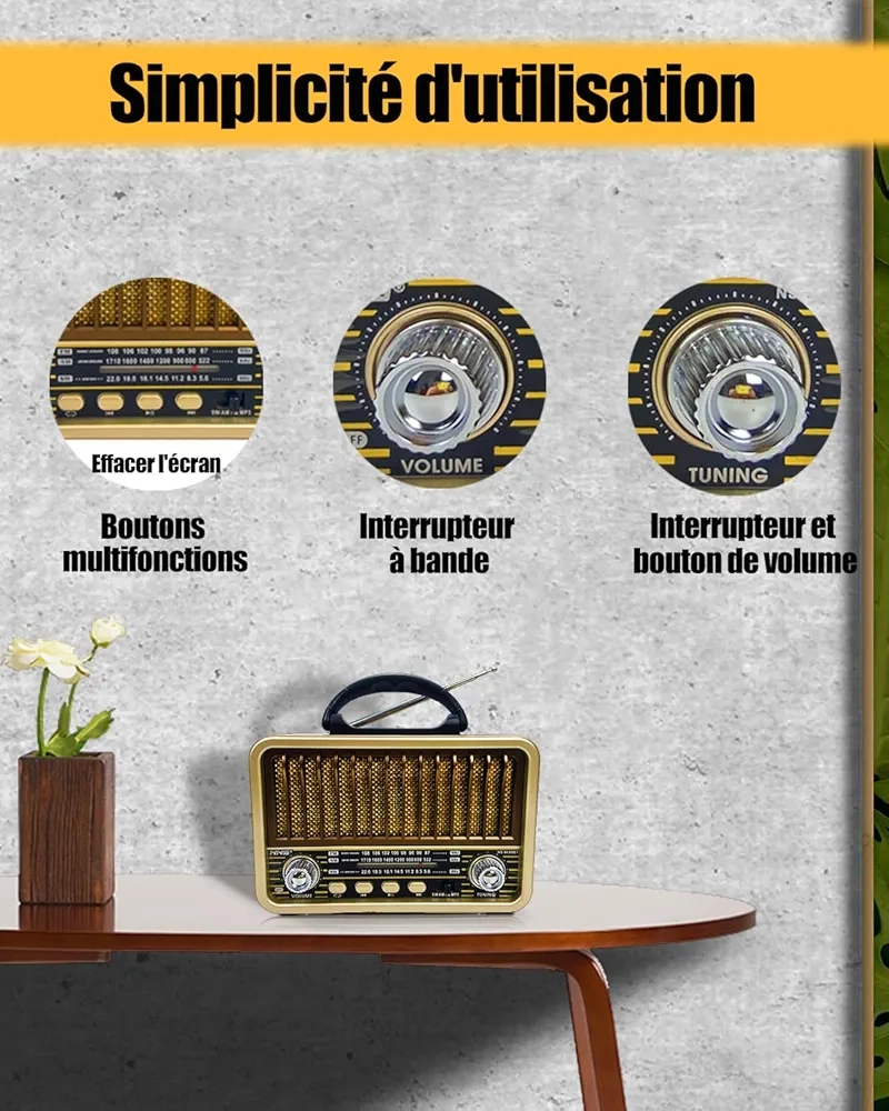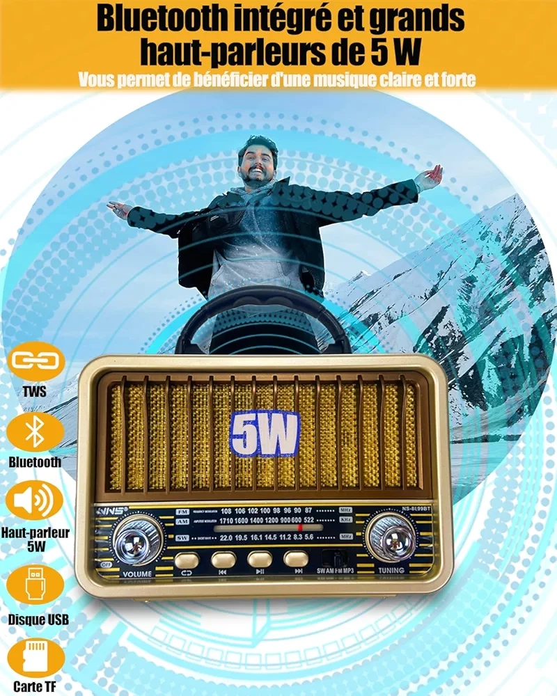Radio Portable – Mini Style Vintage – Bandes AM/SW/FM – Fonctions TWS/USB/Carte TF/BT5.0 – Rechargeable