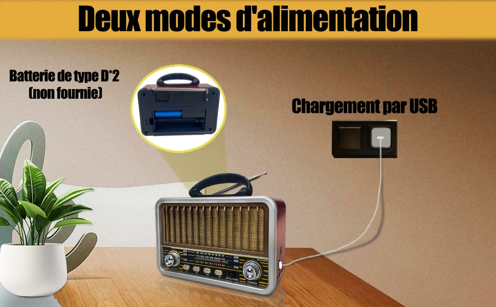L’utilisation du câble USB fourni ou de deux piles de type D (non fournies) garantit un fonctionnement optimal de cette radio à piles, aussi bien à l’intérieur qu’à l’extérieur.