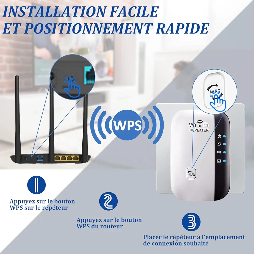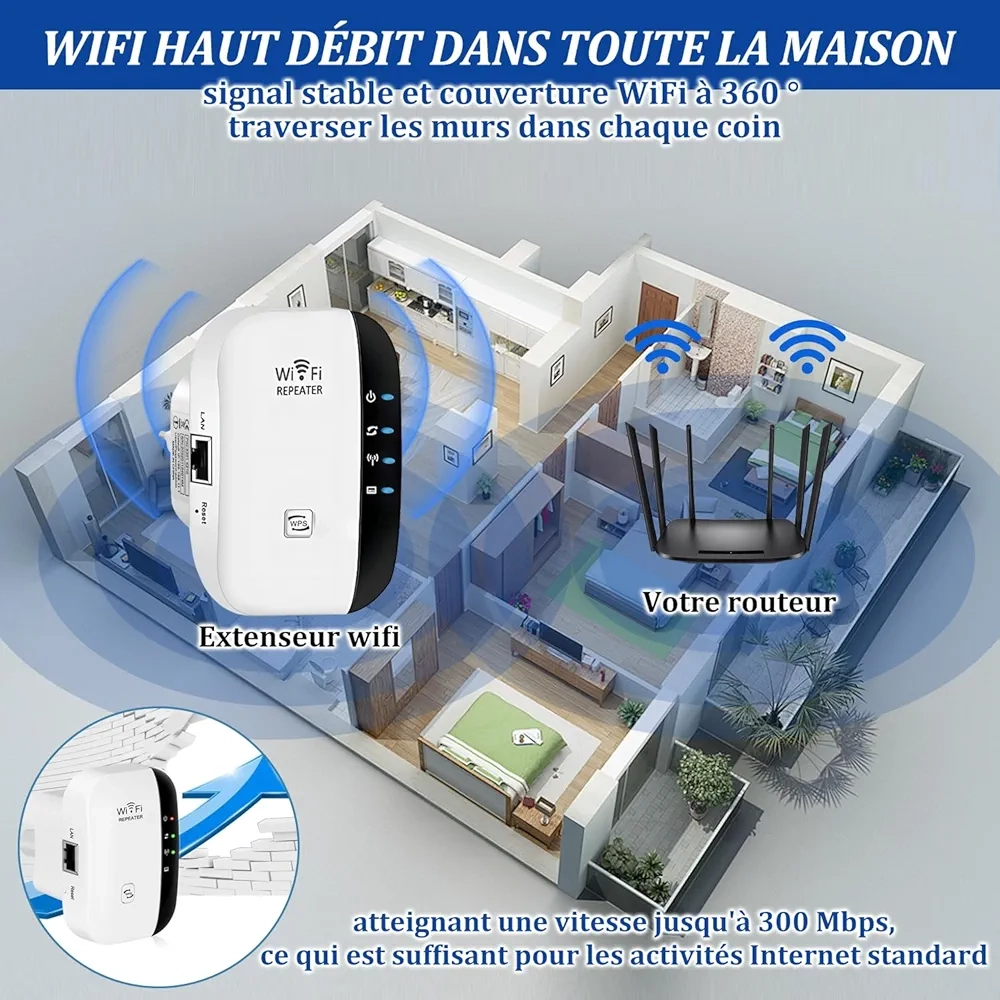 Le répéteur Wi-Fi WEIMEIH amplifie le signal Internet de votre routeur, étendant son réseau Wi-Fi 300 Mbit/s/2,4 GHz aux zones non couvertes par votre routeur, pour des transferts de données fluides et rapides.
