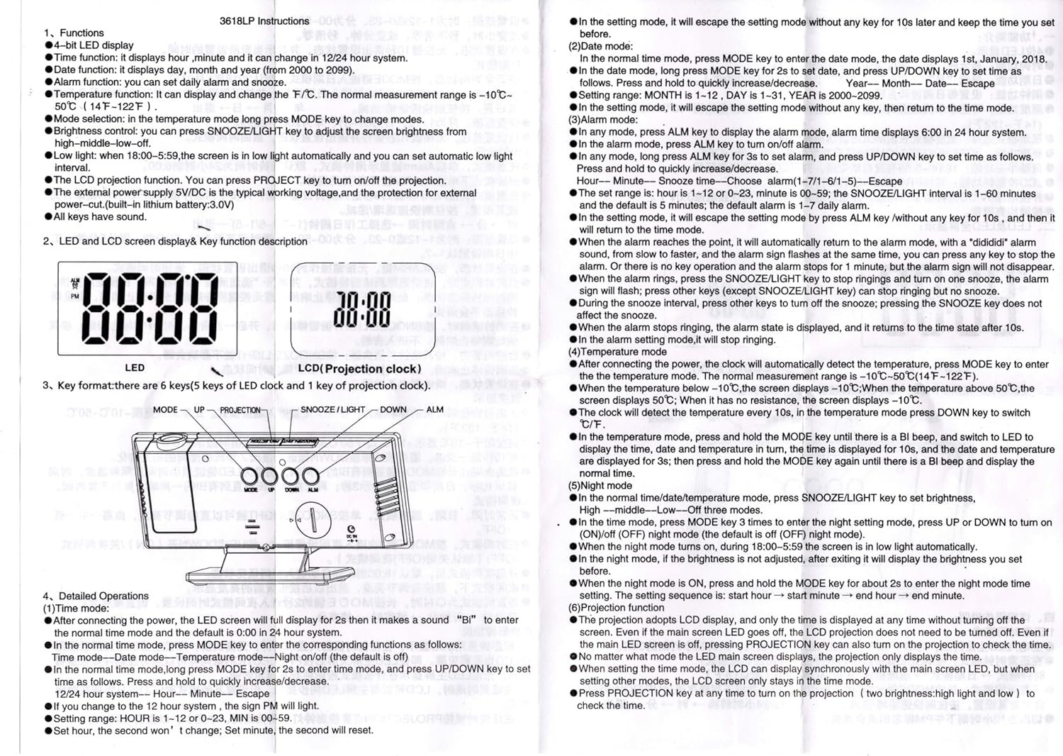 L’écran LED de 7,5 pouces affiche l’heure de l’horloge, l’heure de l’alarme, la date du calendrier, le jour de la semaine et la température.