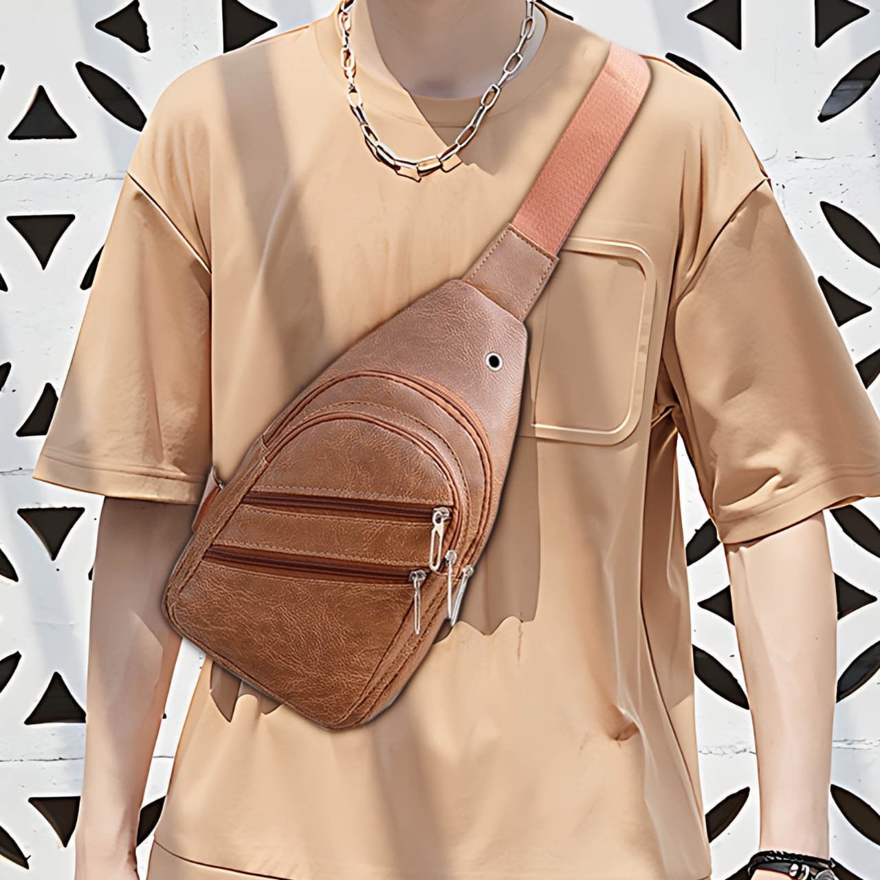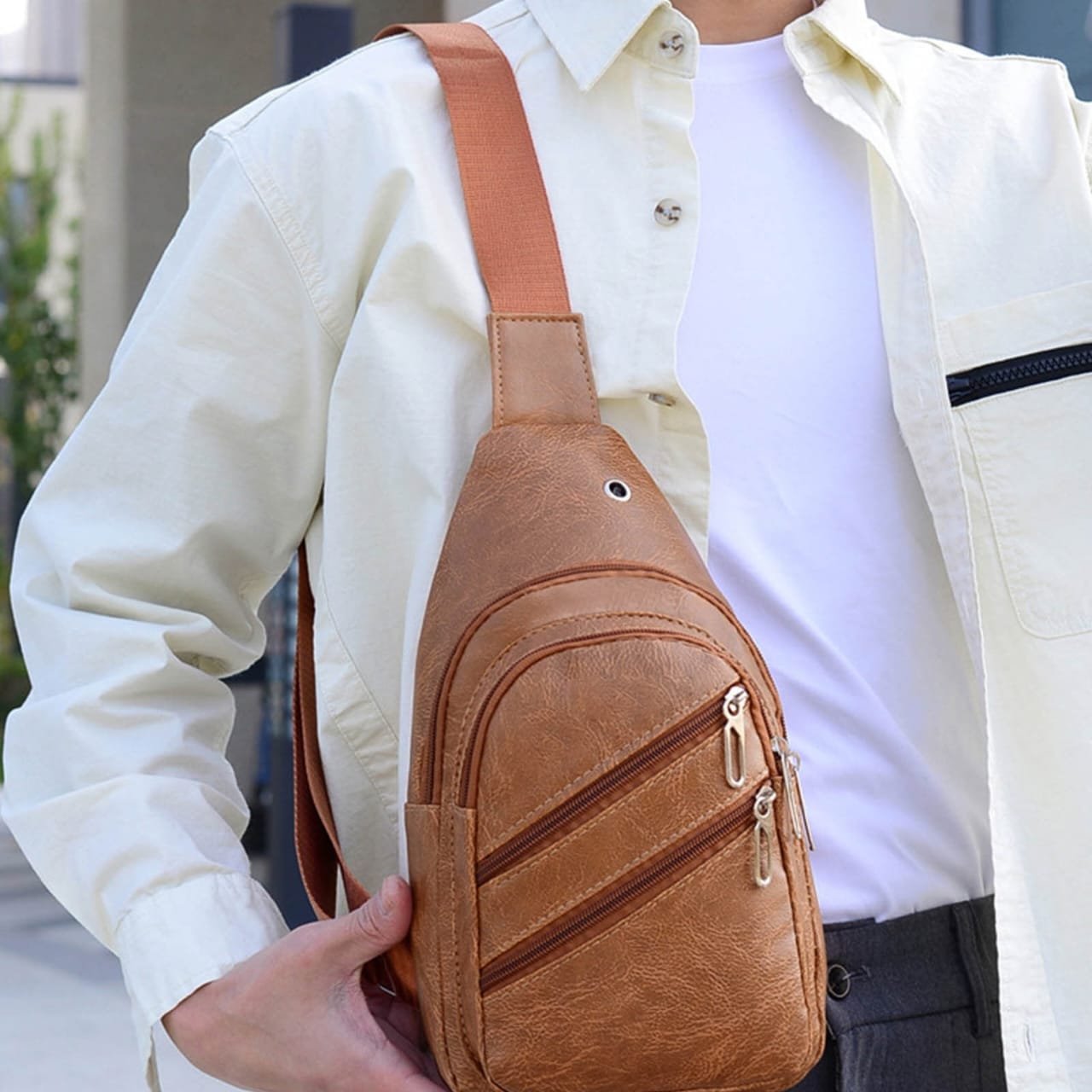 Sac à Bandoulière Multifonction Tondeuse en Cuir PU Souple et Imperméable Pour Homme Avec Trou Pour Écouteurs – Beige