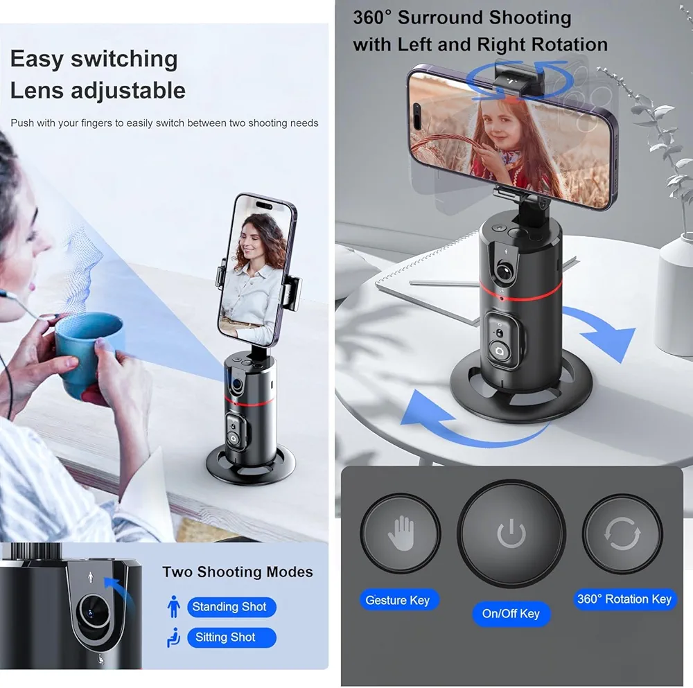 Avec une caméra intégrée, le support de téléphone à suivi du visage peut vous suivre intelligemment, sans avoir besoin de télécharger une application ou de se connecter via Bluetooth. Compatible avec toutes les applications vidéo comme Tiktok, Instagram, Facebook, Zoom, streaming en direct, capture de photos et de vidéos.