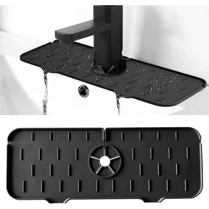 Tapis d’évier de robinet en silicone et porte savon et chiffon 2 en 1 – Noir