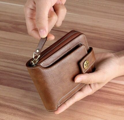 Le prix initial était : 80,000 DT.52,000 DTLe prix actuel est : 52,000 DT.Portefeuille Classique en Cuir PU – Haute Qualité – Moraillon Court et Fermeture Éclair – Multi-Poches – Marron